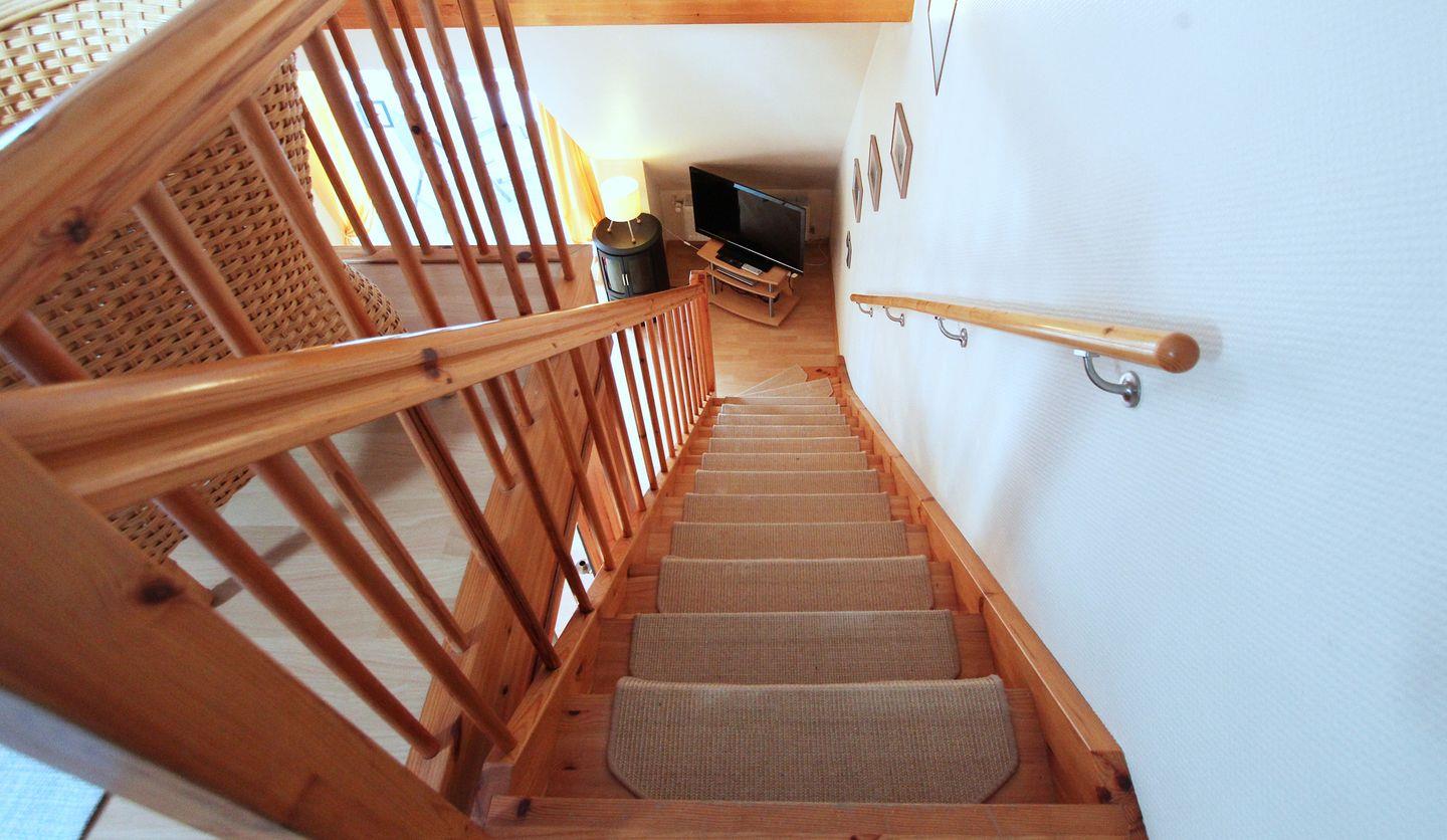 Ein Highlight der Wohnung ist die offene Schlafgalerie, die über eine Treppe erreichbar ist. Hier befindet sich ein komfortables Doppelbett, das für erholsamen Schlaf sorgt. Das angrenzende Badezimmer ist mit einer Dusche, einem Waschbecken und einem WC ausgestattet.