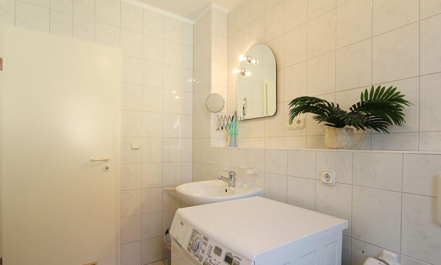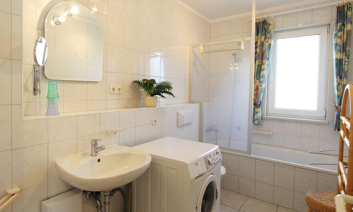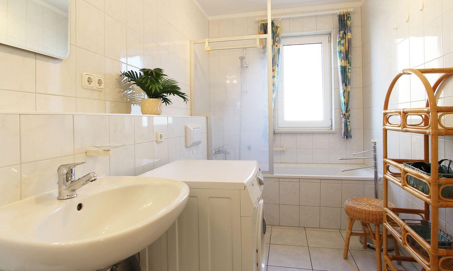 Das Badezimmer ist funktional und komfortabel gestaltet. Hier stehen Ihnen eine Dusche mit Wanne, eine Badewanne, ein Waschbecken, ein WC sowie ein Fenster zur Verfügung. Für zusätzlichen Komfort gibt es einen Waschmaschine zur Eigennutzung, einen Wäscheständer sowie einen Staubsauger.