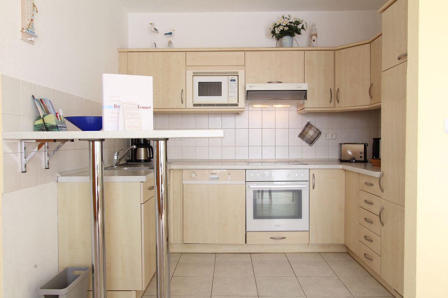 Die offen zum Wohnzimmer gestaltete Küche ist mit umfangreichen Kochutensilien versehen. Sie finden hier einen Ceranherd, einen Elektro-Backofen, eine Spülmaschine, Kühlschrank mit integriertem Gefrierfach, Kaffeemaschine, Wasserkocher und Toaster. Geschirr, Besteck und Geschirrhandtücher sind vorhanden, sodass Sie während Ihres Aufenthaltes bestens versorgt sind.