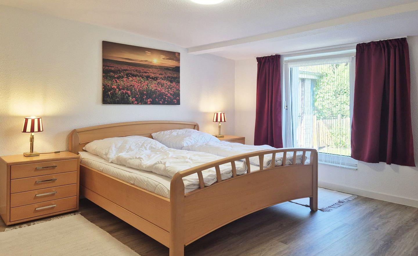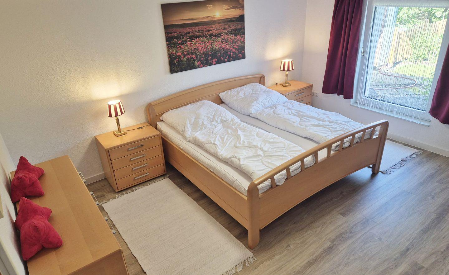 Das Schlafzimmer ist großzügig geschnitten und ist über zwei Stufen nach unten, durch den Wohnbereich zu erreichen. Es gibt ein Doppelbett, eine Kleiderstange, eine Kommode und ein großes Fenster.