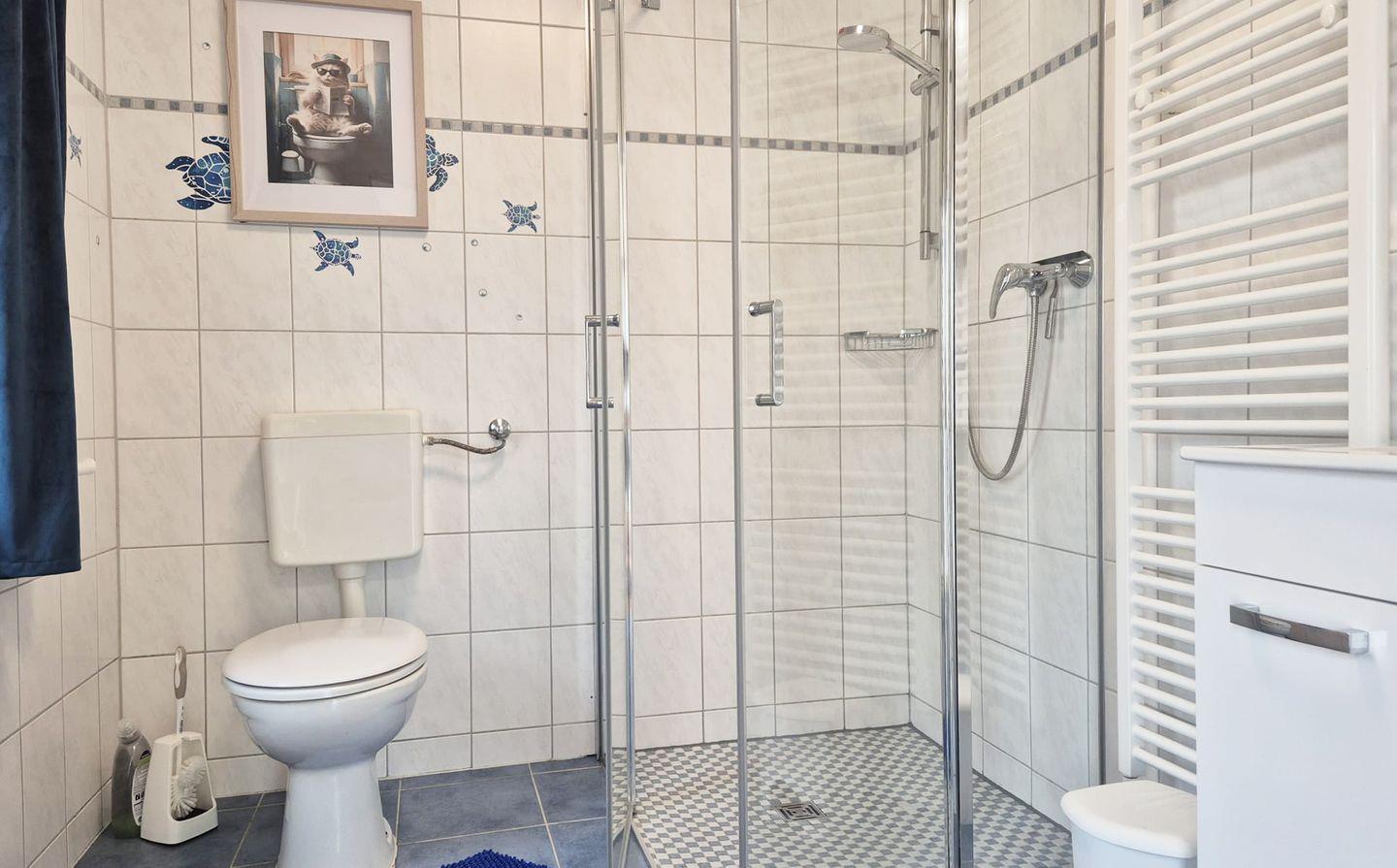 Das Duschbad hat eine ebenerdige Dusche, es gibt ein WC und Tageslichtfenster.