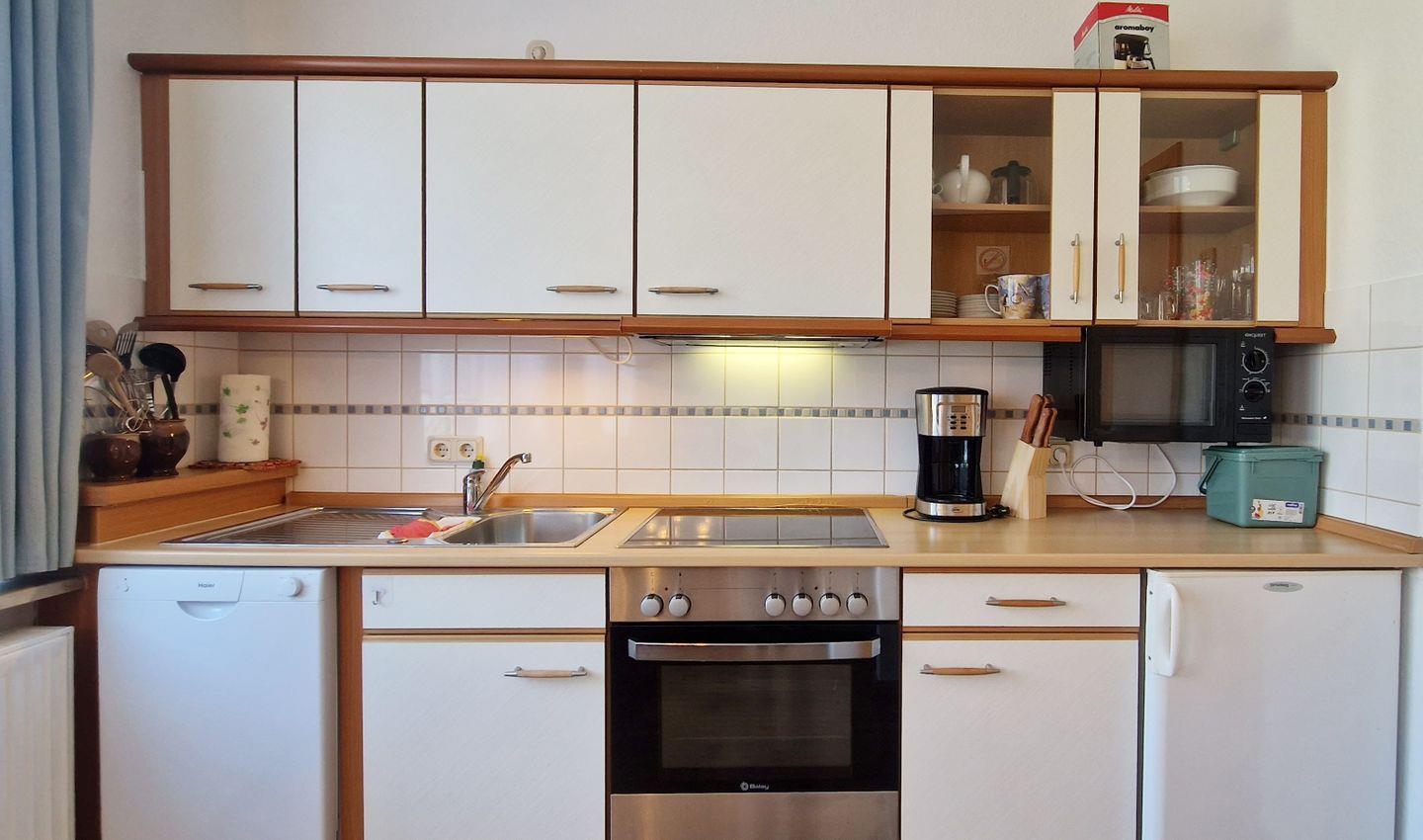 Die Küche hat einen Geschirrspüler, einen 4er Ceranfeld und einen Backofen. Mikrowelle, Kaffeemaschine, Wasserkocher, Eierkocher und Toaster sind auch vorhanden.