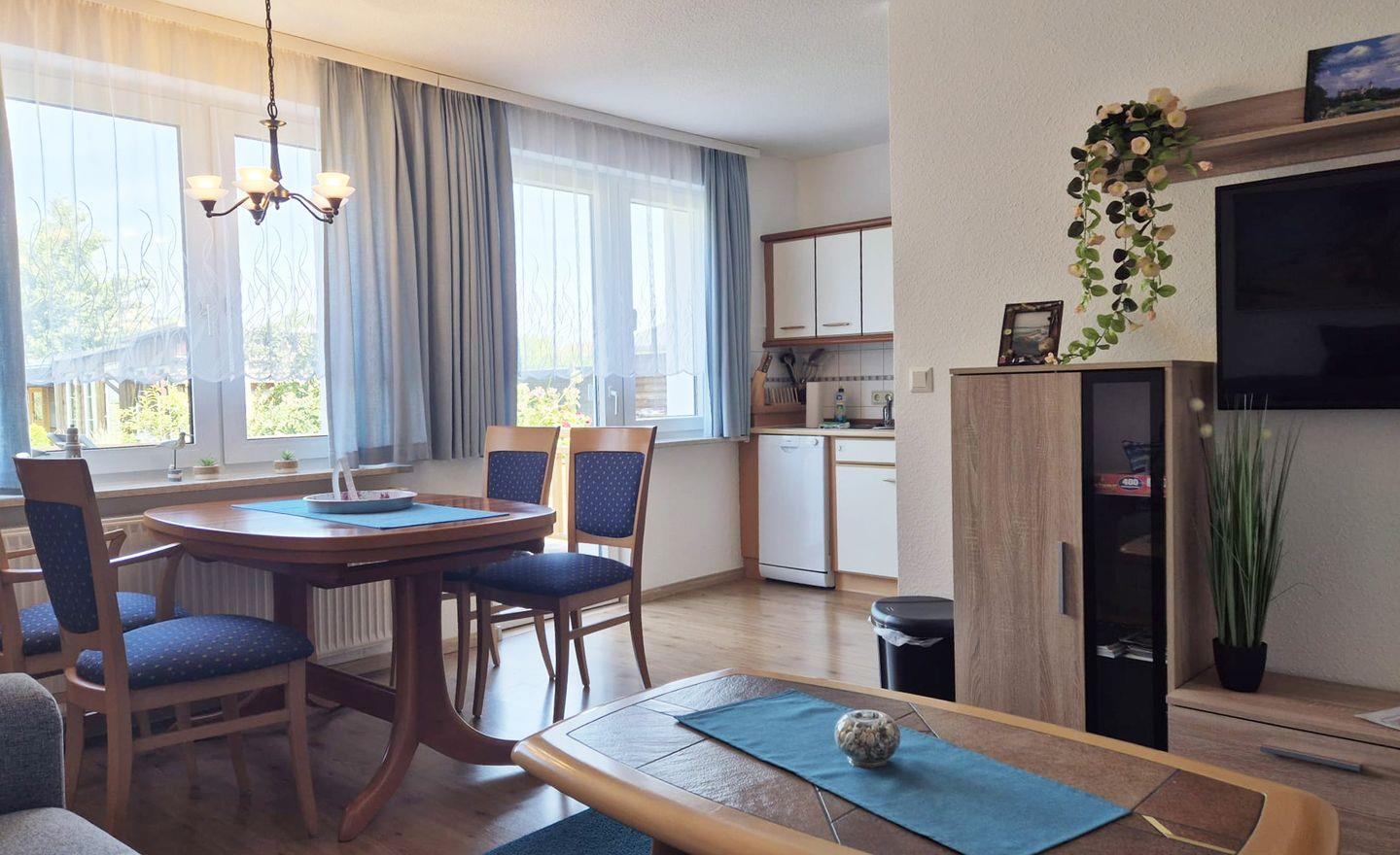 Das geräumige Wohnzimmer verfügt über eine Sitzecke mit Schlafsofa, Sessel, einen TV sowie einen Essbereich mit offener Küche.