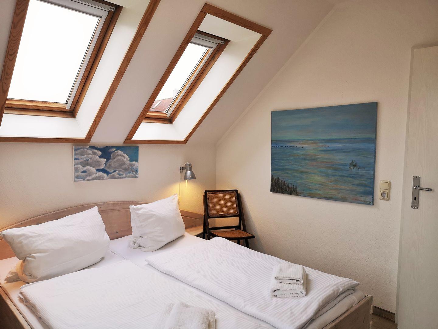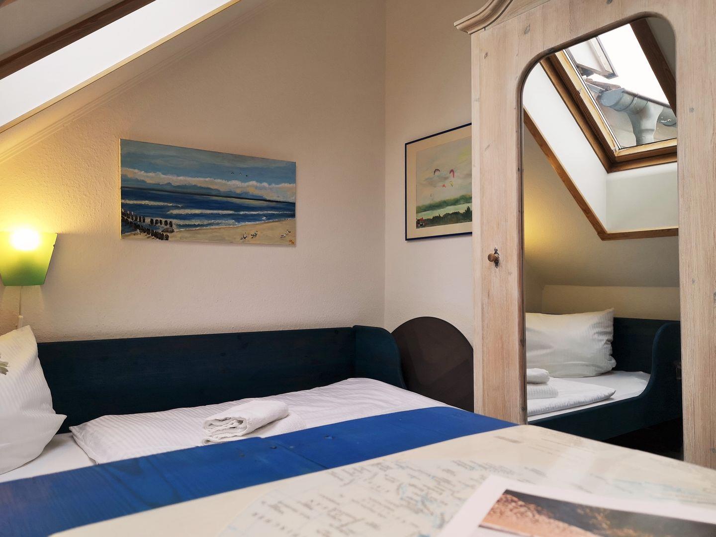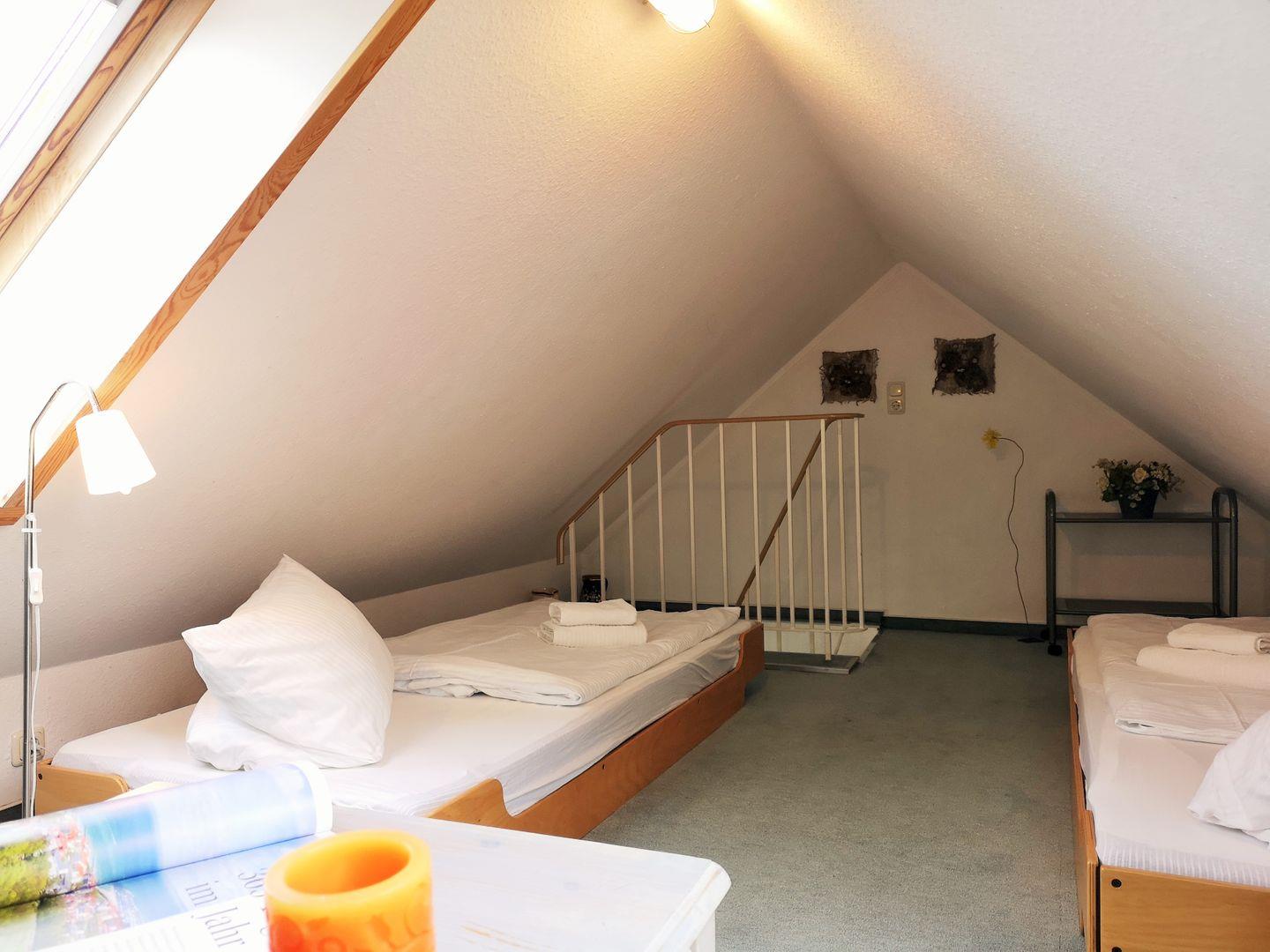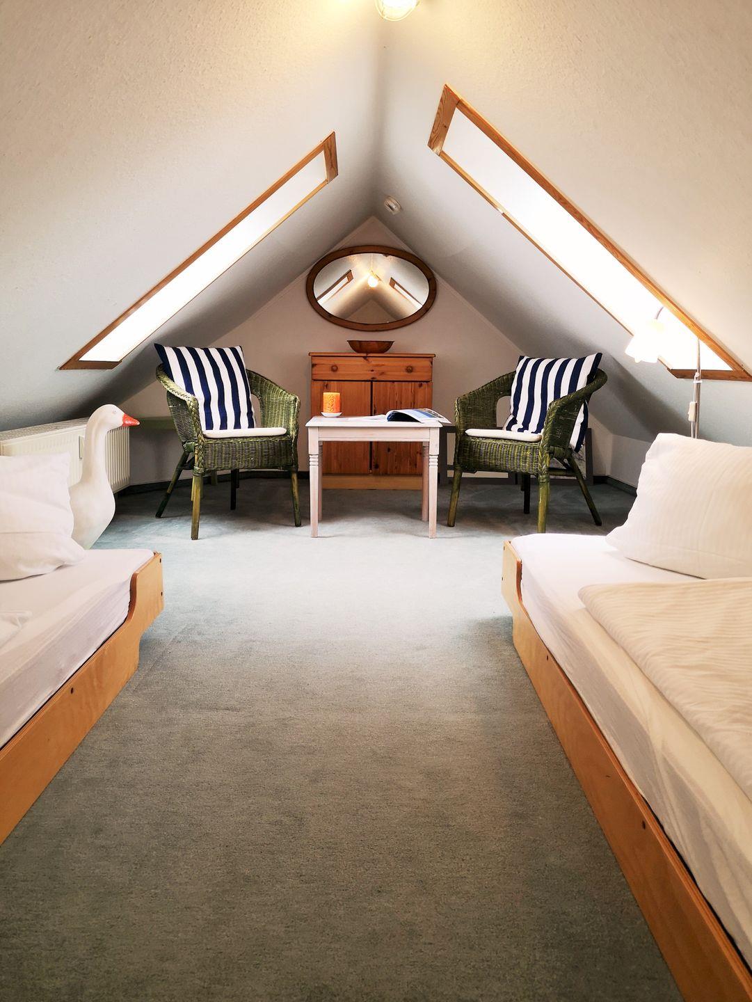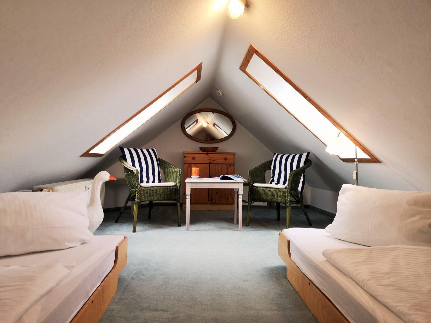 Über eine kleine Treppe aus dem Wohnzimmer erreichen Sie das Dachgeschoss der Wohnung mit dem 3. Schlafzimmer. Dieses ist mit 2 freistehenden Einzelbetten, einer kleinen Kommode sowie 2 Korbsesseln mit Tischchen eingerichtet. Wichtiger Hinweis: auf Grund der relativ steilen Treppe ist dieser Raum nicht (!) für kleine Kinder geeignet!