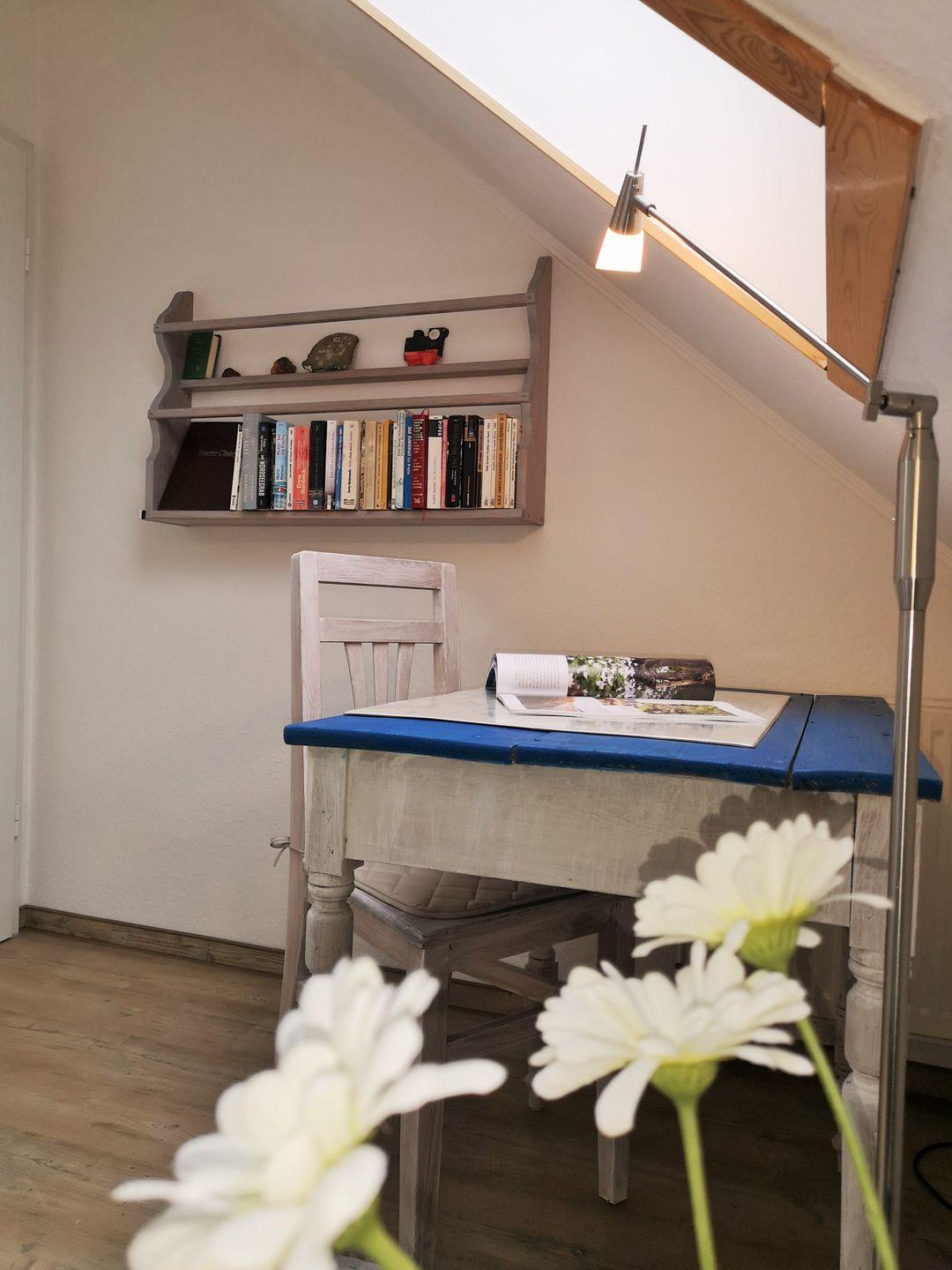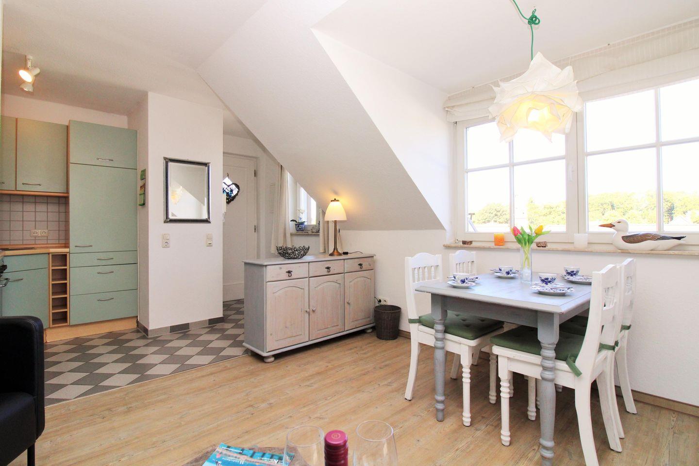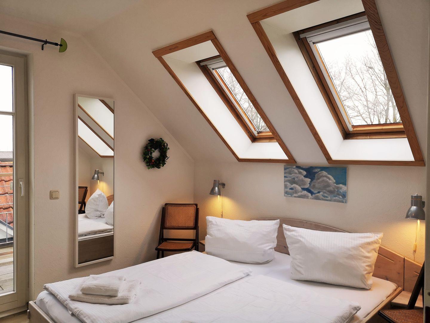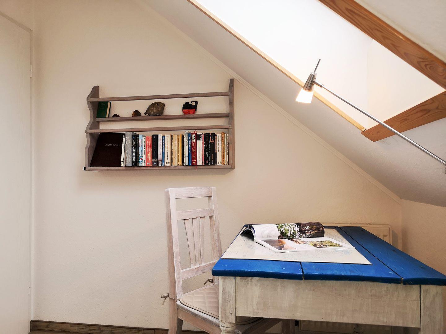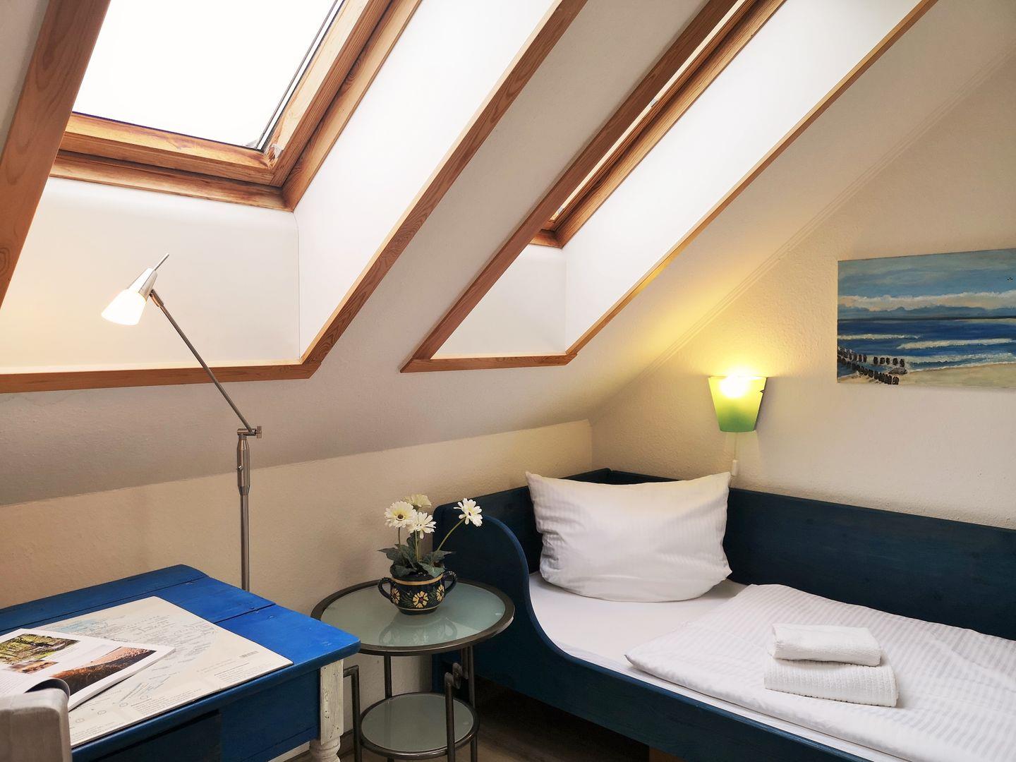 Über eine kleine Treppe aus dem Wohnzimmer erreichen Sie das Dachgeschoss der Wohnung mit dem 3. Schlafzimmer. Dieses ist mit 2 freistehenden Einzelbetten, einer kleinen Kommode sowie 2 Korbsesseln mit Tischchen eingerichtet. Wichtiger Hinweis: auf Grund der relativ steilen Treppe ist dieser Raum nicht (!) für kleine Kinder geeignet!