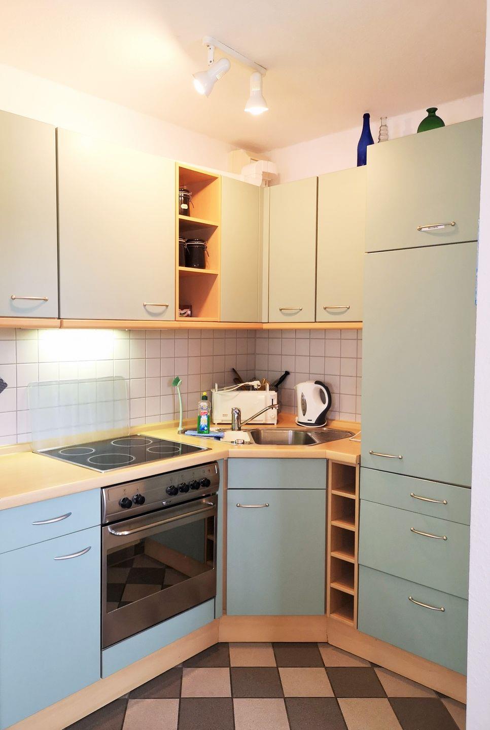 Die offene Küche beinhaltet eine voll ausgestattete Einbauküchenzeile mit 4-Platten-Ceran-Kochfeld, Backofen, Mikrowelle, Geschirrspüler, Kühlschrank mit Gefrierfach, Kaffeemaschine, French-Press-Kaffeekanne, Wasserkocher und Toaster. Die Küche ist mit Geschirr, Gläsern, Besteck und Töpfen bestens und ausreichend ausgestattet.