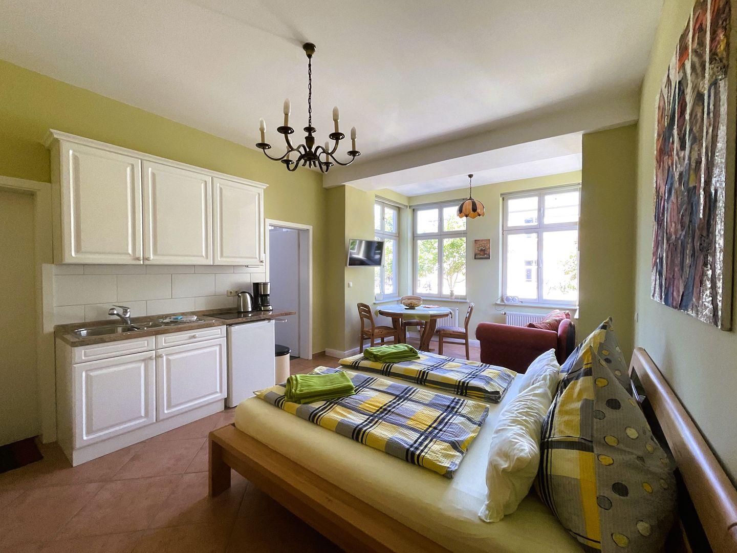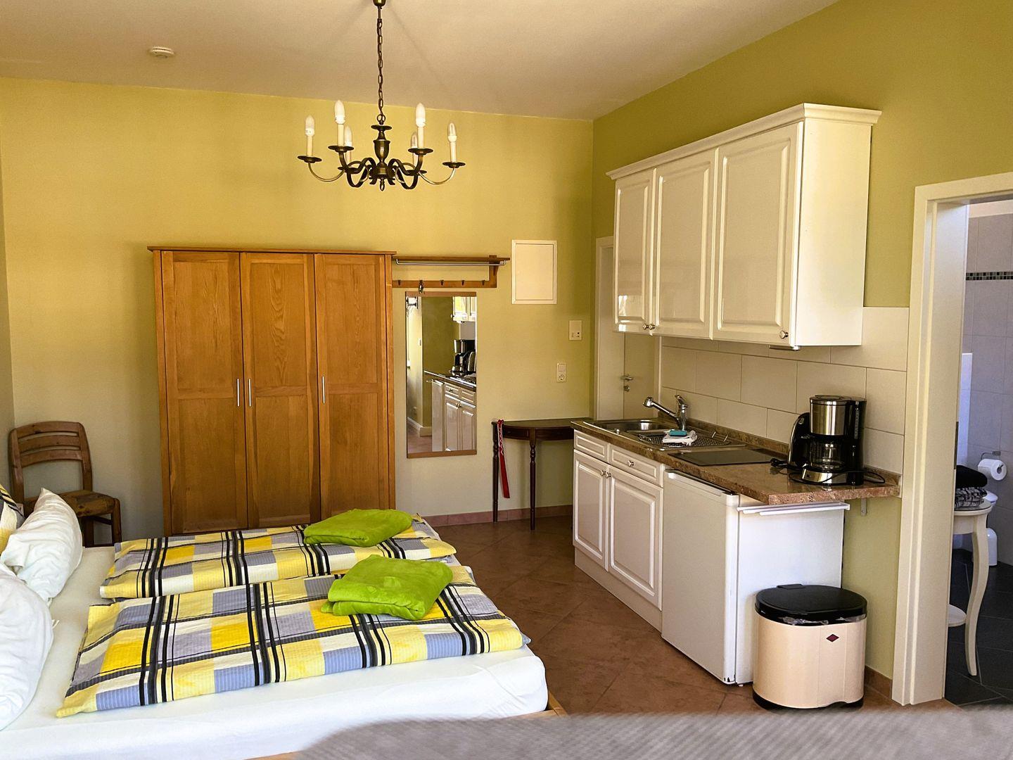 Es verfügt über W-LAN, Kabel TV, Radio, Dusche/WC, Föhn, Miniküche, Wasserkocher, Kaffeemaschine, Toaster und Schlafsofa.