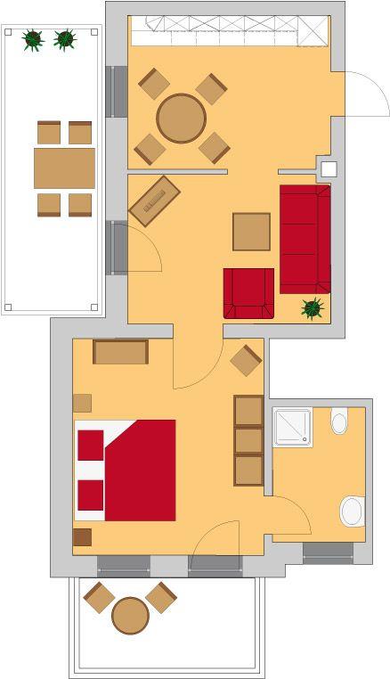 Das Appartment 4 befindet sich im Obergeschoß der Villa Magda , ist ca. 45 m² groß und hat zusätzlich einen Balkon sowie eine große überdachte Terrasse.