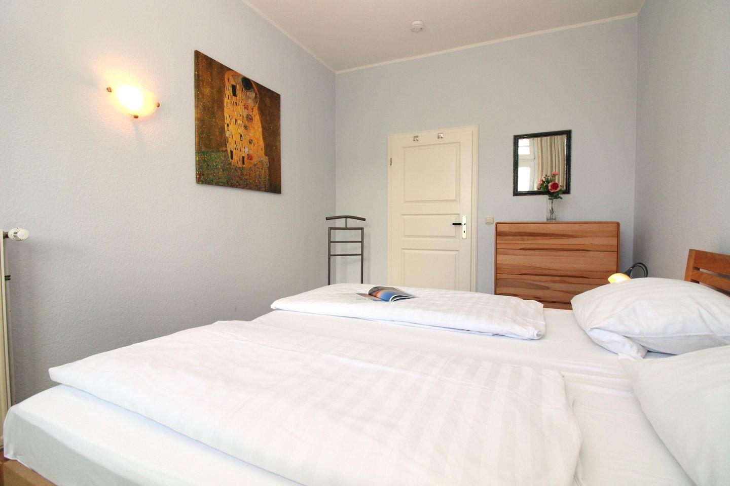 Das separate und zusätzliche 2. Schlafzimmer verfügt ebenfalls über ein bequemes Doppelbett (2 x 90 cm x 200 cm), Nachttische mit Nachttischlampen, einen geräumigen Kleiderschrank sowie einen Wandspiegel.
