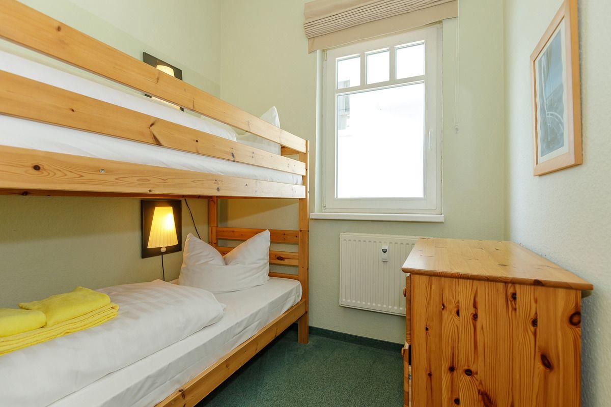 Das separate und zusätzliche 2. Schlafzimmer verfügt über ein bequemes Etagenbett (80 cm x 200 cm) für 2 Personen, Nachttischlampen sowie eine Kommode.