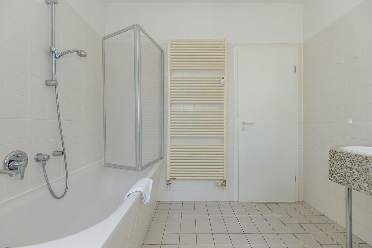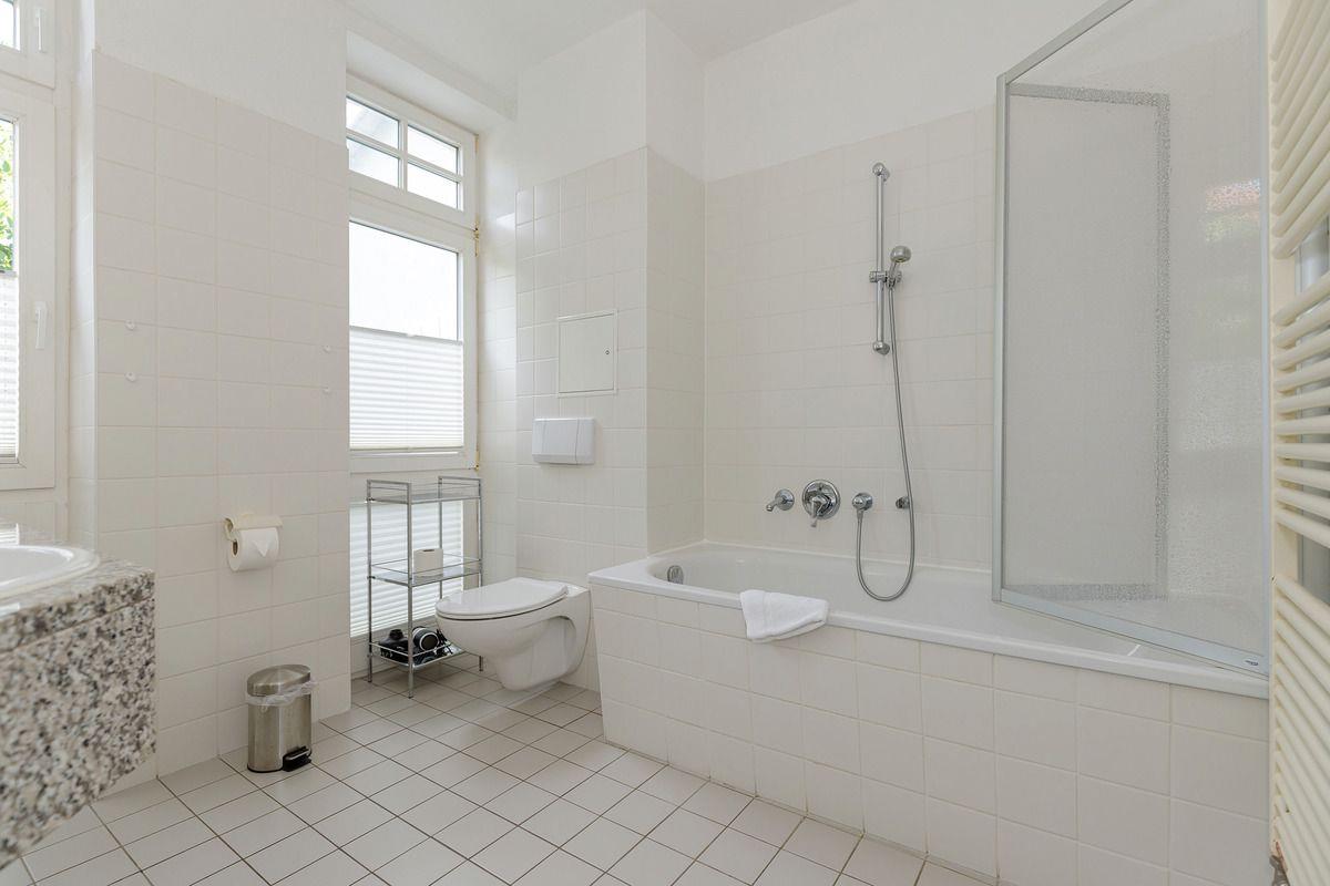 Das helle und geräumige Badezimmer (mit Tageslicht / Fenster) verfügt über eine Badewanne mit Duschtrennwand, einen Waschtisch mit 2 Waschbecken, WC, Handtuch-Heizkörper, Föhn sowie verschiedene Regale und Ablagemöglichkeiten.