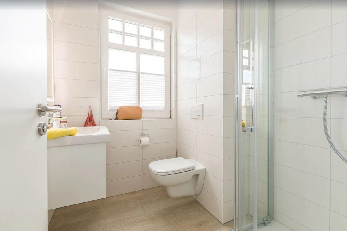 Das moderne Badezimmer (mit Tageslicht / Fenster) verfügt über eine Echtglas-Dusche mit niedrigem Einstieg (seniorenfreundlich!), Waschbecken mit Unterschrank, Handtuch-Heizkörper, Föhn sowie WC.