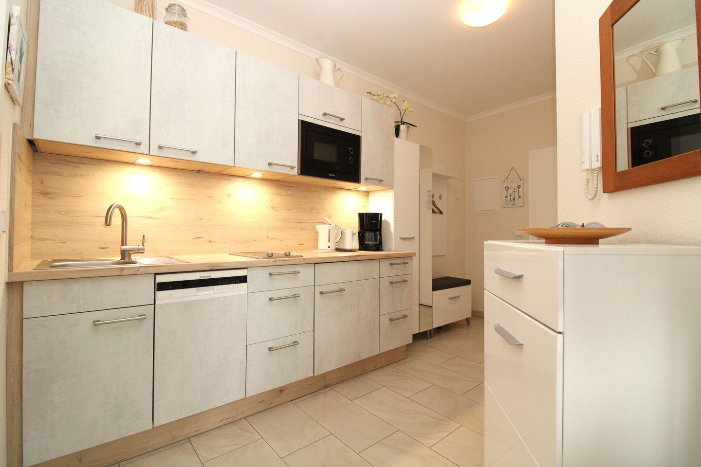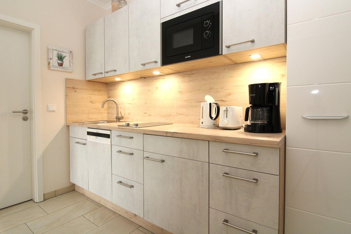 Die offene Küche beinhaltet eine voll ausgestattete Einbauküchenzeile mit 2-Zonen-Ceran-Kochfeld, Dunstabzug, Mikrowelle, Kühlschrank mit Gefrierfach, Geschirrspülmaschine, Kaffeemaschine, Wasserkocher und Toaster. Darüber hinaus steht Ihnen ein kleiner portabler Backofen zur Verfügung. Die Küche ist mit Geschirr, Gläsern, Besteck und Töpfen komplett ausgestattet.