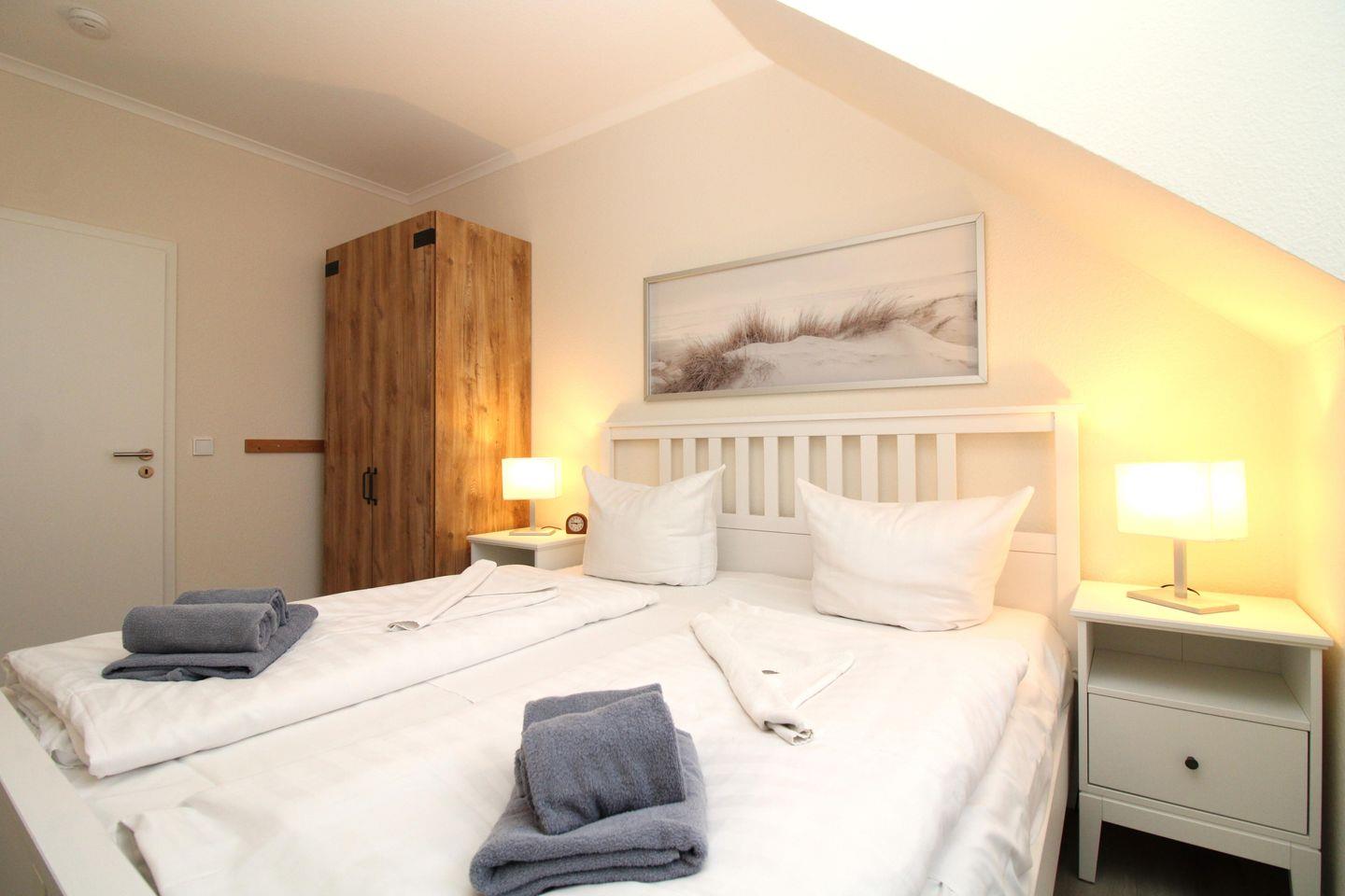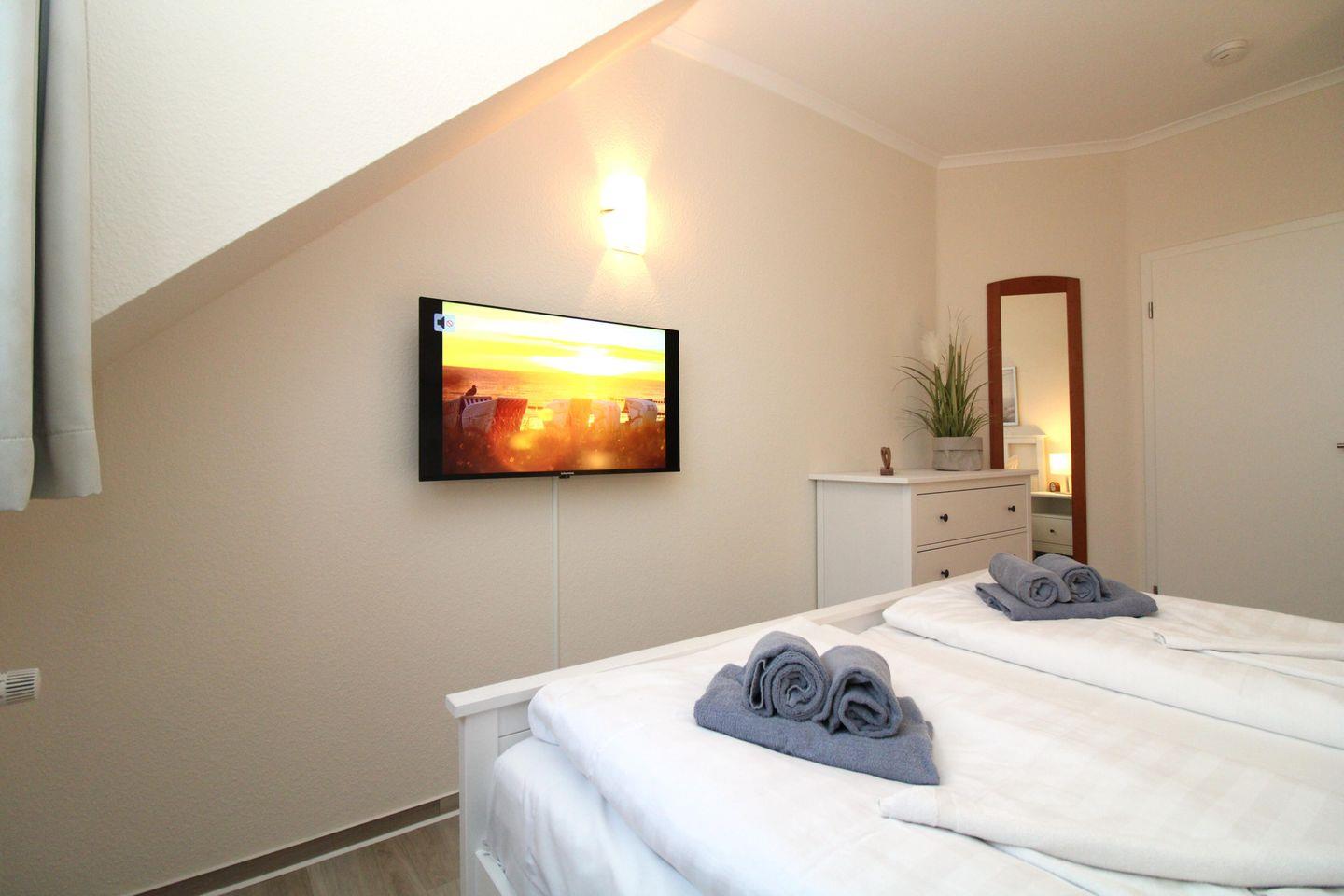 Das gemütliche und helle Schlafzimmer ist mit einem bequemen Doppelbett (2 x 90 cm x 200 cm), Nachttischen mit Nachttischlampen, einem geräumigen Kleiderschrank, einer Kommode, einem großen Wandspiegel sowie einem weiteren zusätzlichen TV-Gerät eingerichtet.