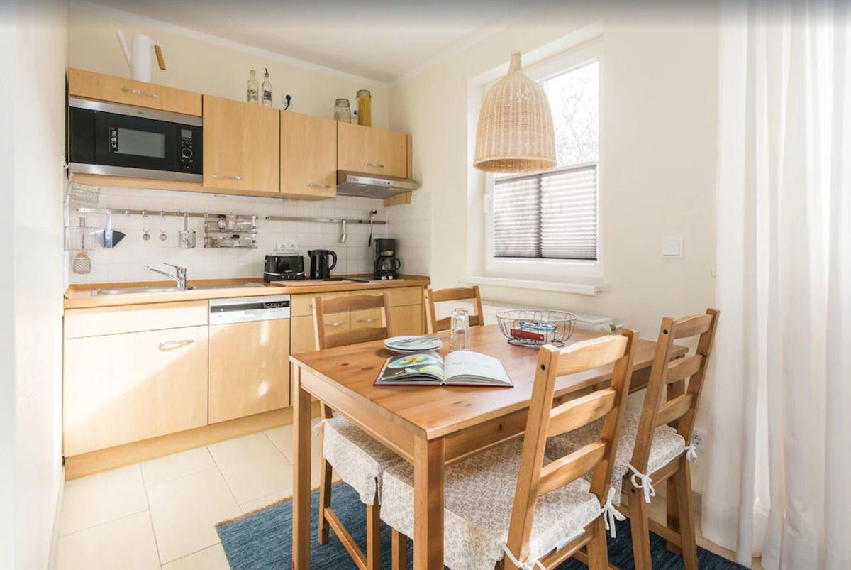Die offene Küche beinhaltet eine voll ausgestattete Einbauküchenzeile mit 2-Zonen-Ceran-Kochfeld, Dunstabzug, Mikrowelle, Kühlschrank mit Gefrierfach, Geschirrspülmaschine, Kaffeemaschine, Wasserkocher und Toaster. Darüber hinaus steht Ihnen ein kleiner portabler Backofen zur Verfügung. Die Küche ist mit Geschirr, Gläsern, Besteck und Töpfen komplett ausgestattet.