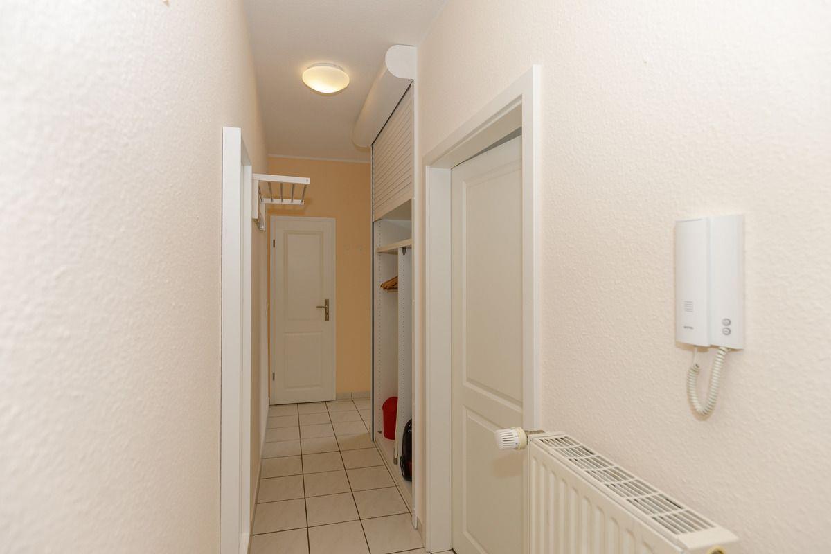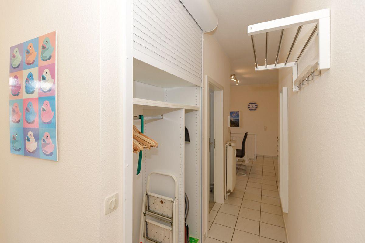 Ihre Jacken und Schuhe können Sie an der Garderobe mit großem Wandspiegel bzw. in dem geräumigen Einbauschrank im Flur der Wohnung unterbringen.