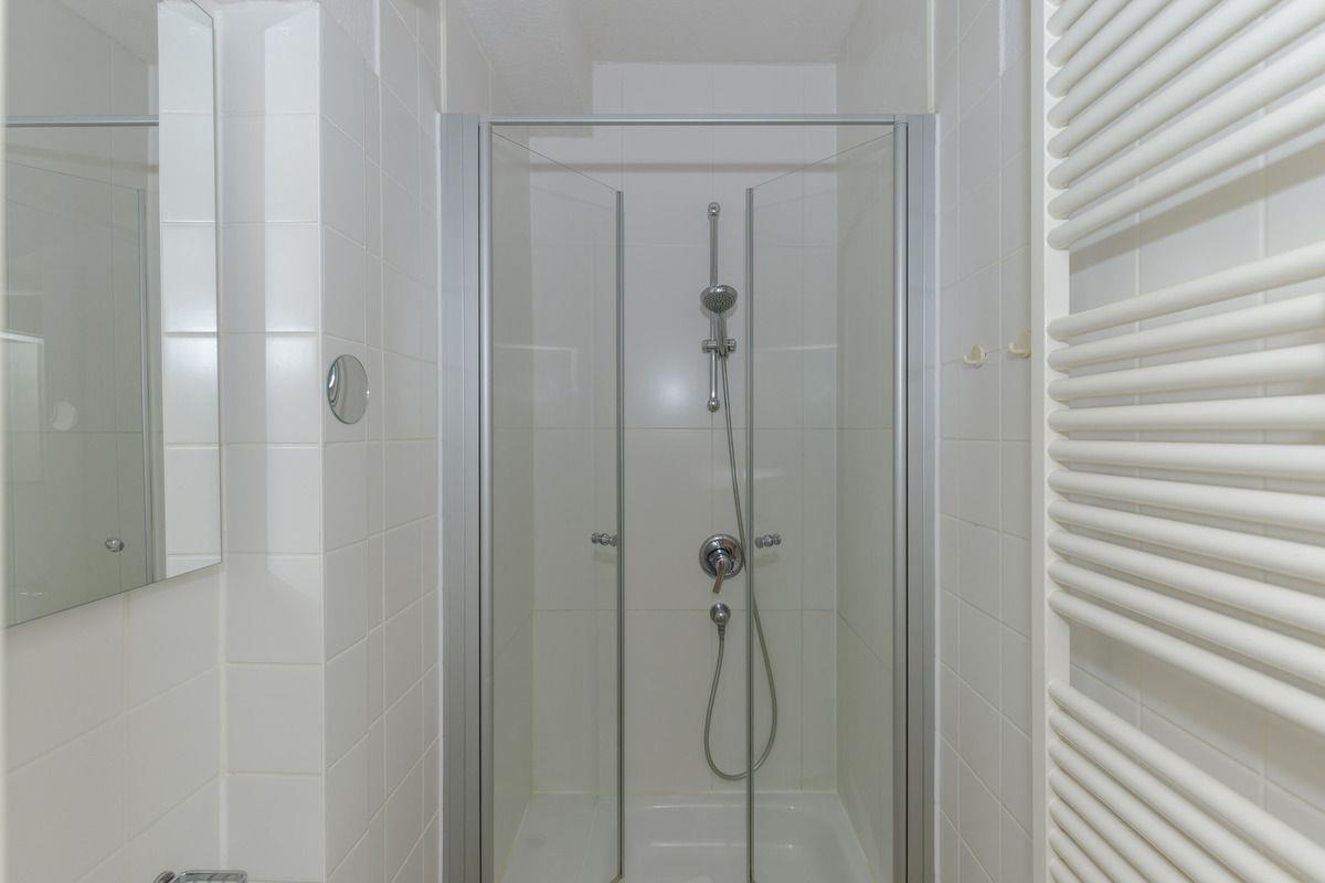 Das Badezimmer verfügt über eine Dusche mit Echtglas-Duschabtrennung, Waschbecken mit Unterschrank sowie einen Handtuch-Heizkörper. In einem separaten Raum befindet sich das WC mit Waschbecken und Unterschrank.