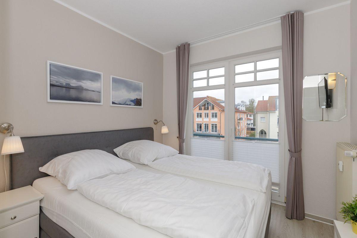 Das freundliche und helle 1. Schlafzimmer mit großen bodentiefen Fenstern (französischer Balkon) ist mit einem bequemen Boxspring-Doppelbett (180 cm x 200 cm), Nachttischen mit Nachttischlampen sowie einem Kleiderschrank eingerichtet. Darüber hinaus steht Ihnen hier ein weiteres TV-Gerät zur Verfügung.