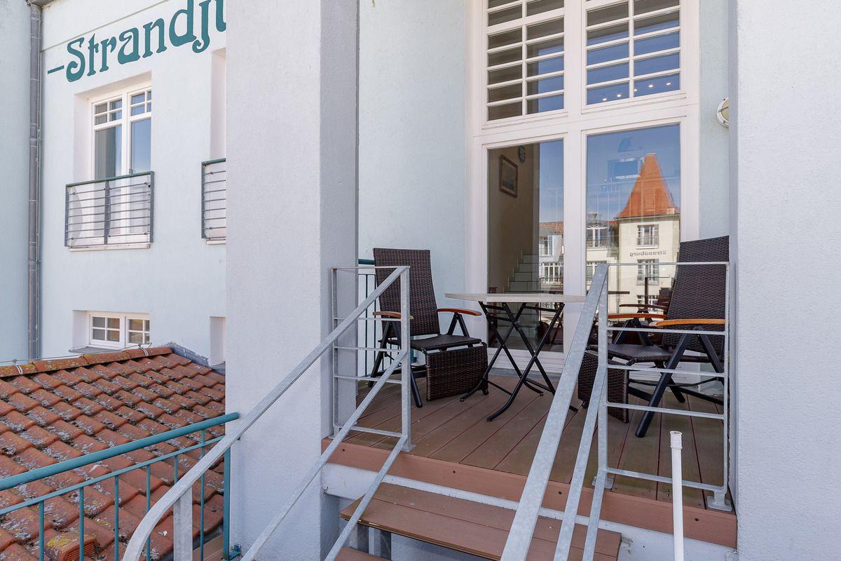 Das moderne und sehr individuell gestaltete Wohn-/Esszimmer über 2 Ebenen verfügt über eine separate Sitzgruppe mit bequemer Couch, 2 Sessel und Couchtisch, einen separaten Esstisch mit Stühlen sowie verschiedene Einbauschränke bzw. -regale. Vom Wohnzimmer aus haben Sie direkten Zugang zu dem ca. 5 m² großen und teilweise überdachten Balkon sowie der sich eine Ebene darunter anschließenden ca. 10 m² großen sonnigen Dachterrasse (nach Süden und Westen ausgerichtet) mit Balkonmöbeln und Sonnenliegen. Hier sitzen Sie entspannt und gemütlich mit einem wunderschönen Blick auf das muntere Treiben in der unten liegenden Strandstraße und können abends bei einem guten Glas Wein in Ruhe die lauen Sommernächte genießen!