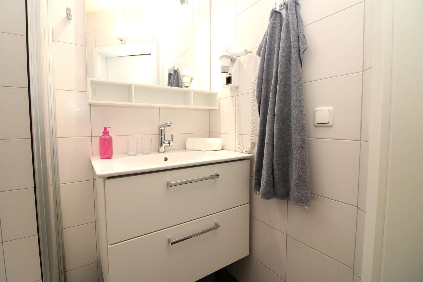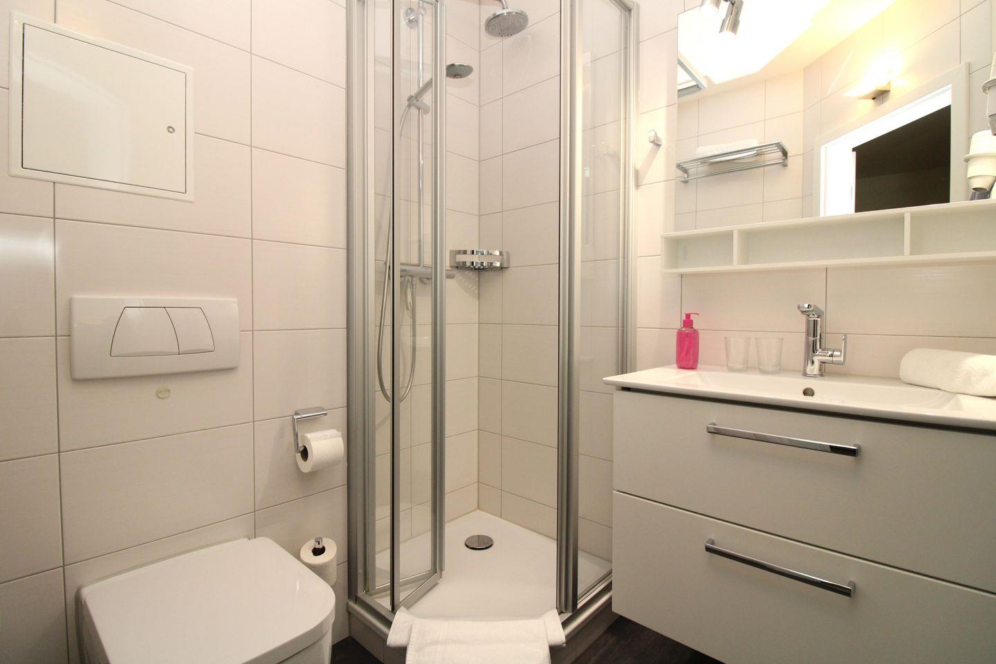 Das moderne Badezimmer verfügt über eine Echtglas-Dusche mit niedrigem Einstieg (seniorenfreundlich!), einen Waschtisch mit großem Wandspiegel und Unterschrank, WC, einen Föhn, einen Handtuch-Heizkörper sowie ausreichend Ablagemöglichkeiten.