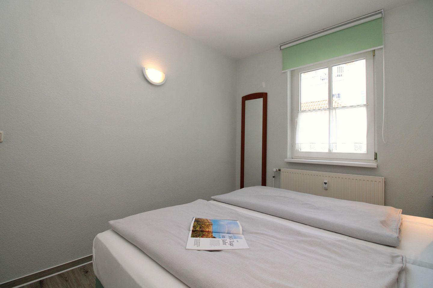Das gemütliche Schlafzimmer ist mit einem bequemen Doppelbett (2 x 90 cm x 200 cm), Nachttischen mit Nachttischlampen sowie einem geräumigen Kleiderschrank eingerichtet.