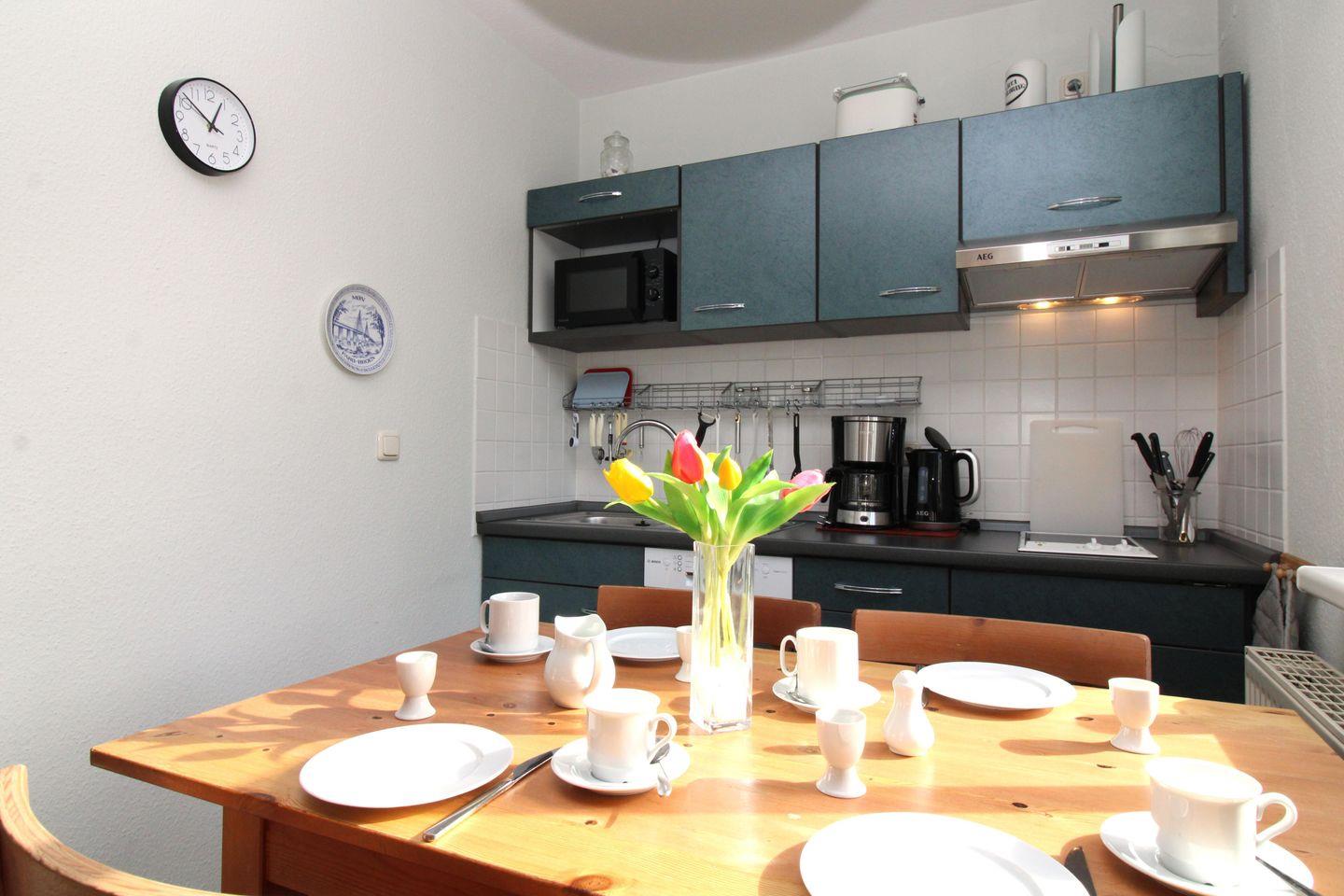 Die offene Küche beinhaltet eine voll ausgestattete Einbauküchenzeile mit 2-Zonen-Ceran-Kochfeld, Dunstabzug, Mikrowelle, Kühlschrank mit Gefrierfach, Geschirrspülmaschine, Kaffeemaschine, Wasserkocher und Toaster. Auf Wunsch stellen wir Ihnen auch gerne einen portablen Backofen zur Verfügung. Die Küche ist mit Geschirr, Gläsern, Besteck und Töpfen komplett ausgestattet.