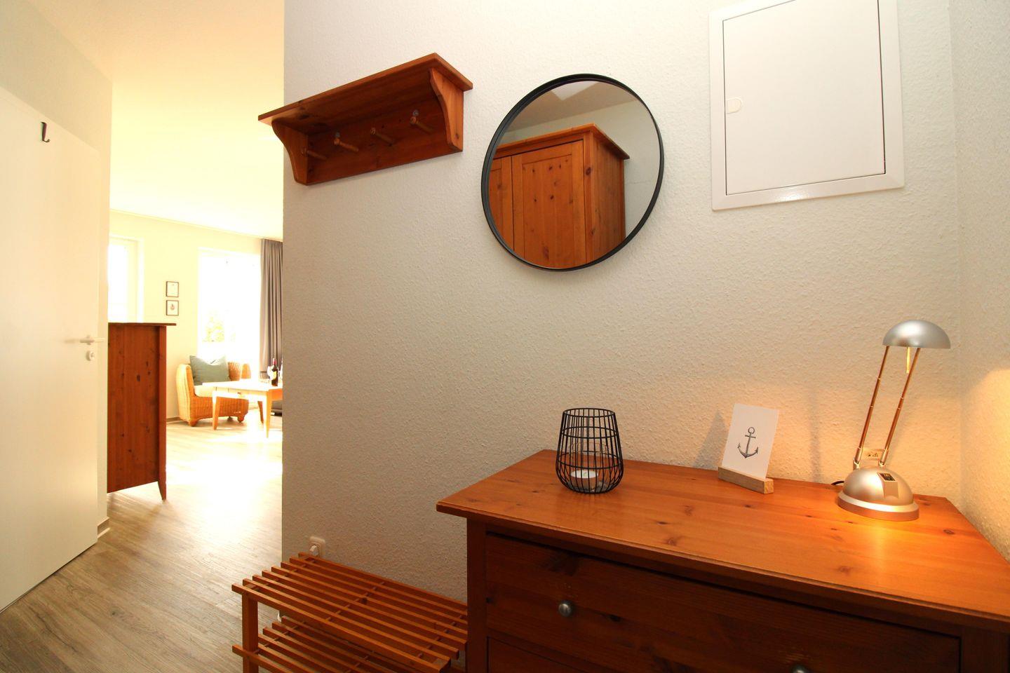 Vom Flur mit Garderobe, Schrank, Kommode, Spiegel und Schuhablage erreichen Sie bequem alle Räume Ihrer Ferienwohnung.