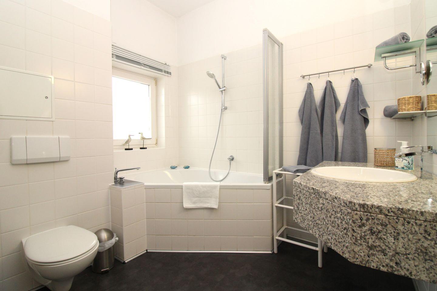 Das helle Badezimmer (im 3. OG) mit Tageslicht (Fenster) verfügt über eine Badewanne mit Dusch-Trennwand, einen großen Waschtisch mit Wandspiegel, verschiedene Regale, WC, Kosmetik-Spiegel, Föhn, Handtuch-Heizkörper sowie ausreichend Ablagemöglichkeiten.