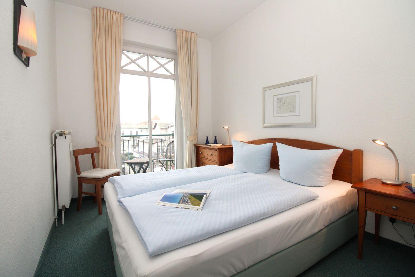 Das freundliche und helle 1. Schlafzimmer (im 3. OG) ist mit einem bequemen Doppelbett (160 cm x 200 cm), Nachttischen mit Nachttischlampen, einer Kommode sowie einem Stuhl eingerichtet. Der Kleiderschrank befindet sich in der Diele. Vom Schlafzimmer aus haben Sie ebenfalls direkten Zugang zu einem weiteren Balkon (nach Süd-Westen ausgerichtet) mit Balkonmöbeln und seitlichem Seeblick.