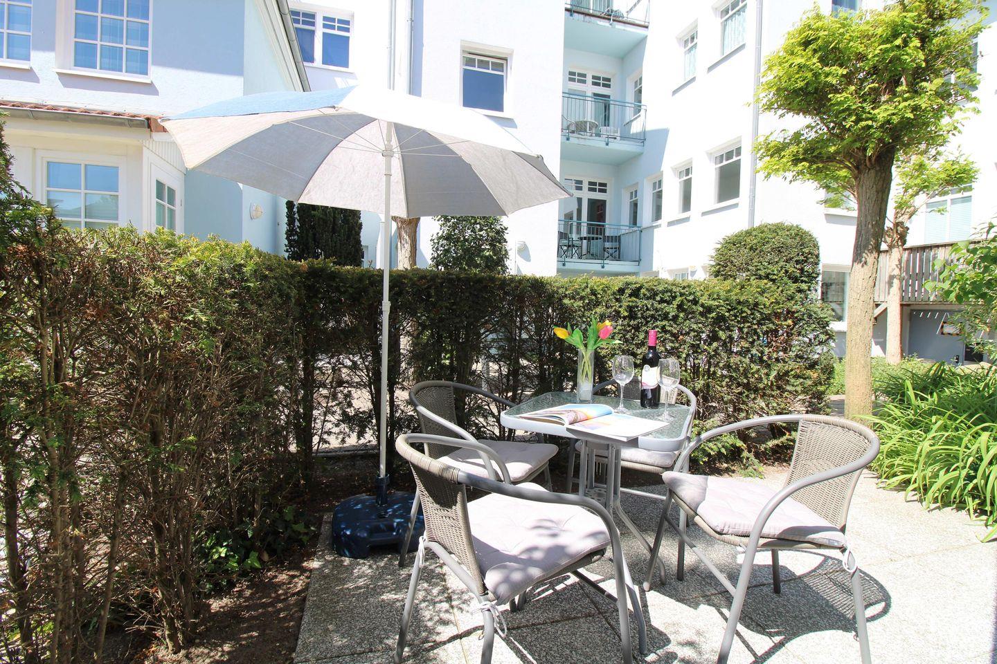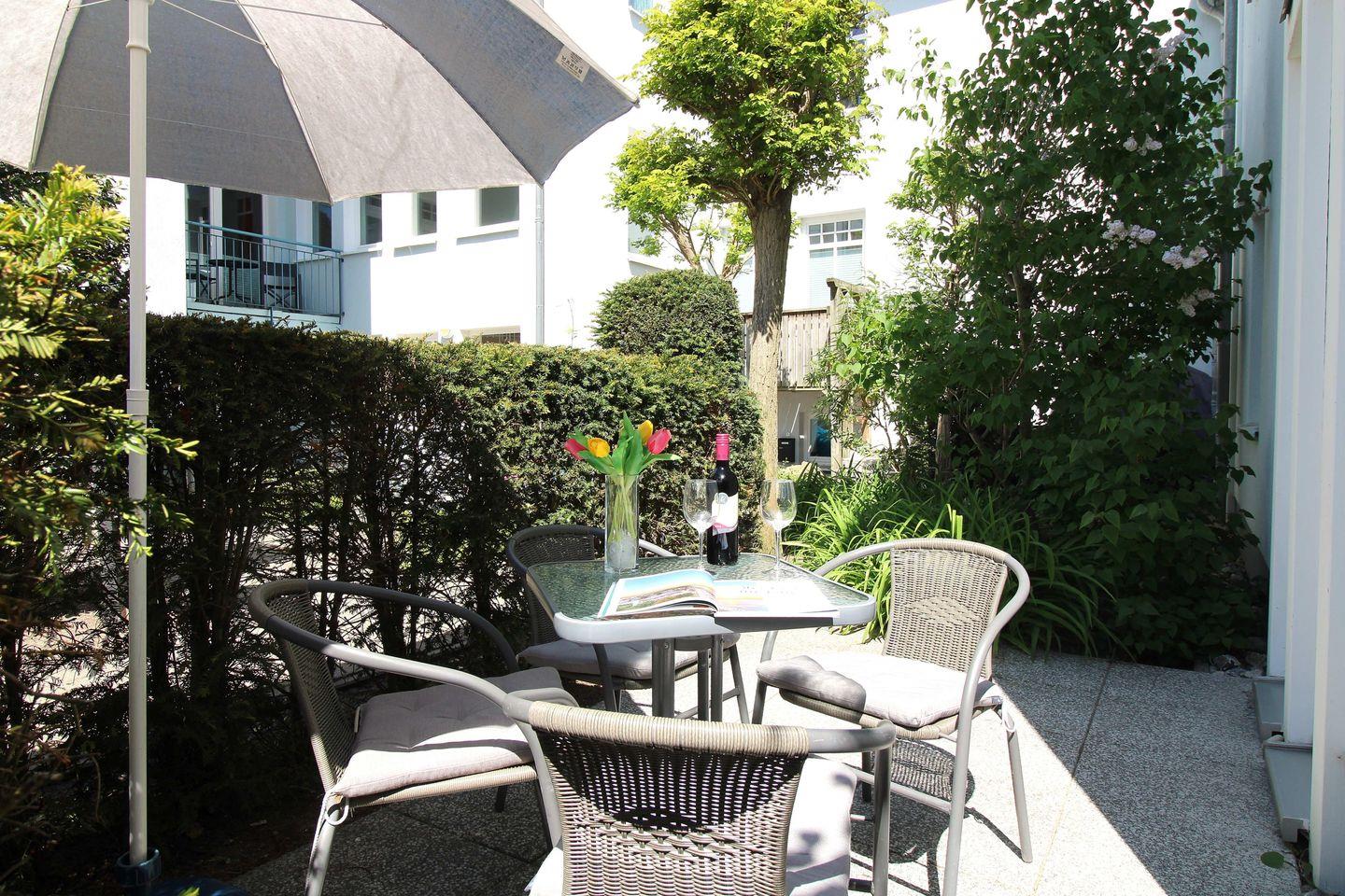 Das geräumige Wohn-/Esszimmer verfügt über eine separate Sitzgruppe mit bequemer (ausziehbarer Schlaf-)Couch, Sessel und Couchtisch, einen separaten Esstisch mit 4 Stühlen sowie einem Sideboard. Vom Wohnzimmer aus haben Sie direkten Zugang zu der ca. 8 m² großen Terrasse (nach Süd-Westen zum Innenhof ausgerichtet) mit Terrassenmöbeln. Hier sitzen Sie entspannt und gemütlich im Grünen und können abends bei einem guten Glas Wein in Ruhe die lauen Sommernächte genießen!