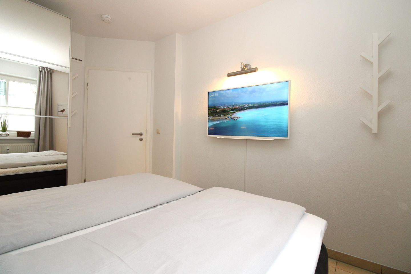 Das moderne und freundliche Schlafzimmer ist mit einem bequemen Boxspring-Doppelbett (2 x 80 cm x 200 cm), Nachttischen mit Nachttischlampen, einem geräumigen Kleiderschrank, 2 Wandgarderoben sowie einem zusätzlichen Flatscreen.TV-Gerät eingerichtet.