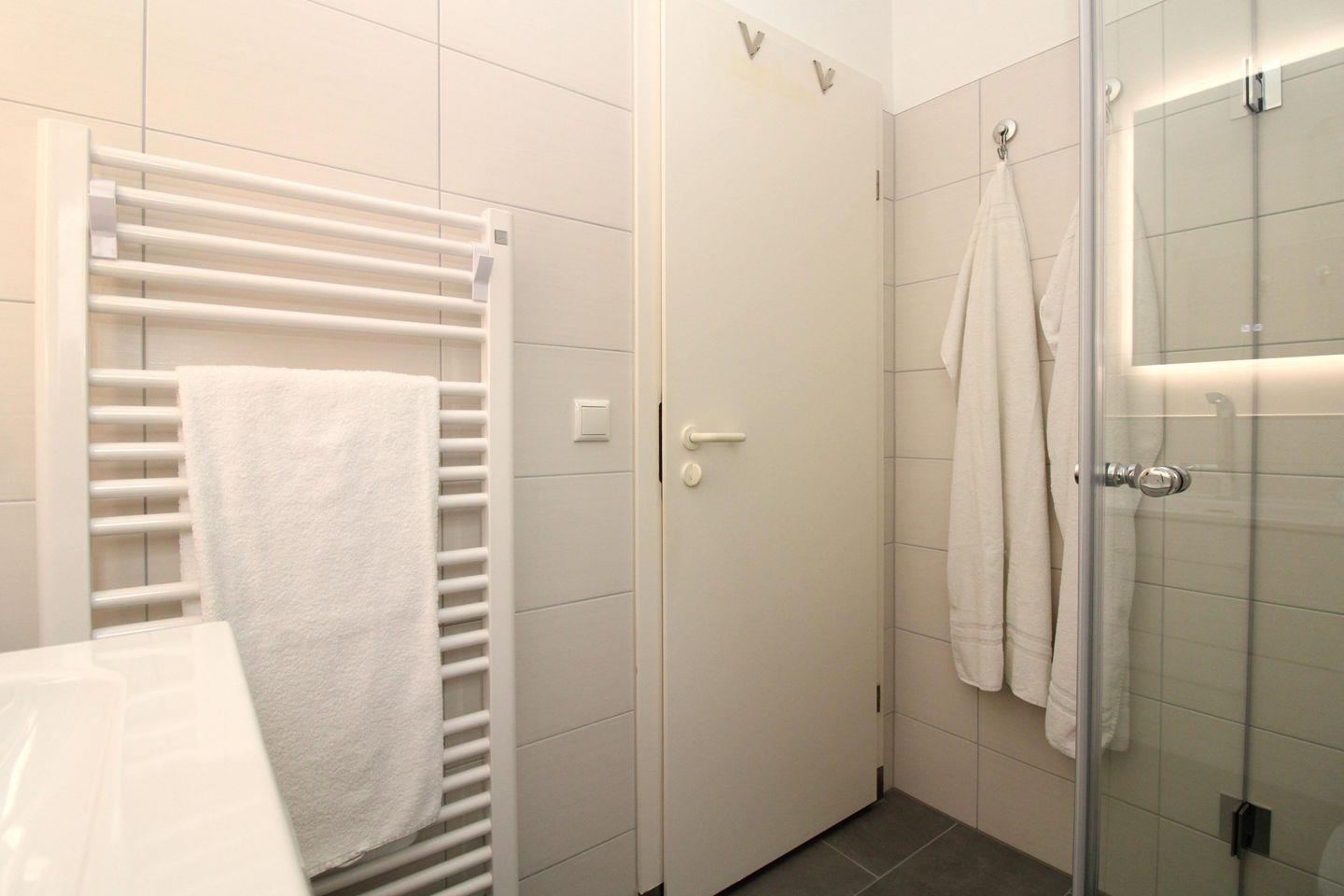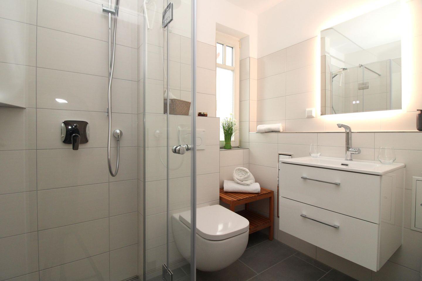 Das helle Badezimmer (mit Tageslicht / Fenster) verfügt über eine Echtglas-Dusche mit bodengleichem Einstieg (seniorenfreundlich), Waschbecken mit Unterschrank, WC, Föhn, einen Handtuch-Heizkörper, ein Badezimmer-Regal sowie ausreichend Ablagemöglichkeiten.