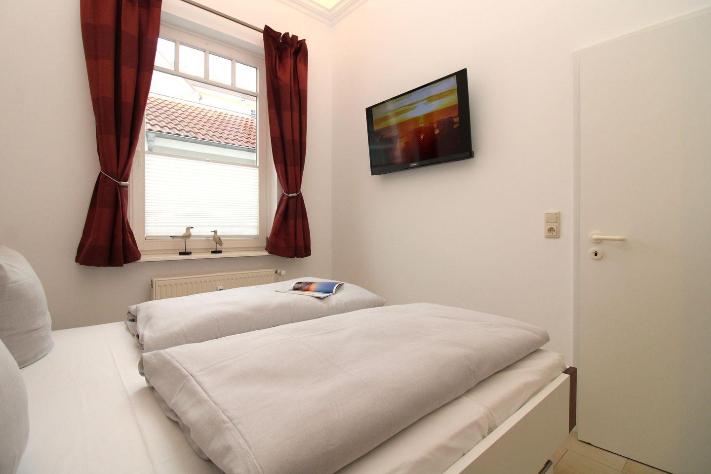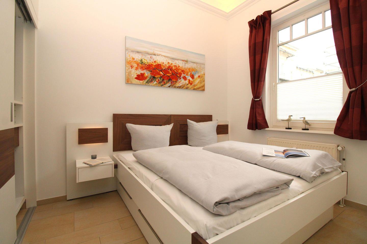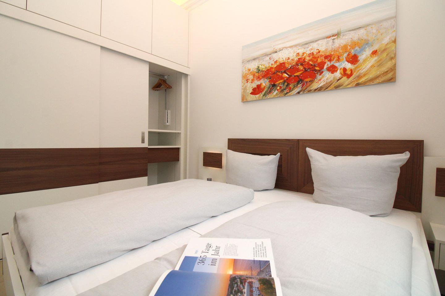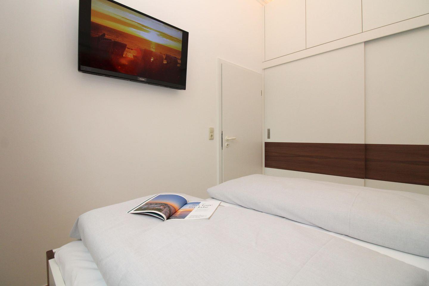 Das komfortable und moderne Schlafzimmer ist mit einem bequemen Doppelbett (160 cm x 200 cm), Nachttischen mit Nachttischlampen sowie einem sehr geräumigen Einbau-Kleiderschrank eingerichtet und verfügt über ein weiteres zusätzliches TV-Gerät. Für einen guten Schlafkomfort verfügt das Schlafzimmer auch über Verdunkelungsvorhänge und ein Plissee.