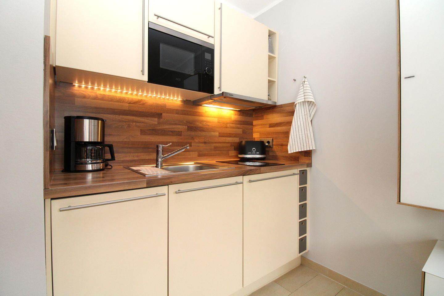 Die moderne offene Küche beinhaltet eine voll ausgestattete Einbauküchenzeile mit 2-Zonen- Ceran-Kochfeld, Dunstabzug, Mikrowelle, Kühlschrank mit Gefrierfach, Geschirrspülmaschine, Kaffeemaschine, Wasserkocher und Toaster. Auf Wunsch stellen wir Ihnen auch gerne einen portablen Backofen zur Verfügung. Die Küche ist mit Geschirr, Gläsern, Besteck und Töpfen komplett ausgestattet.