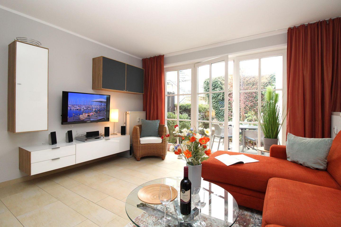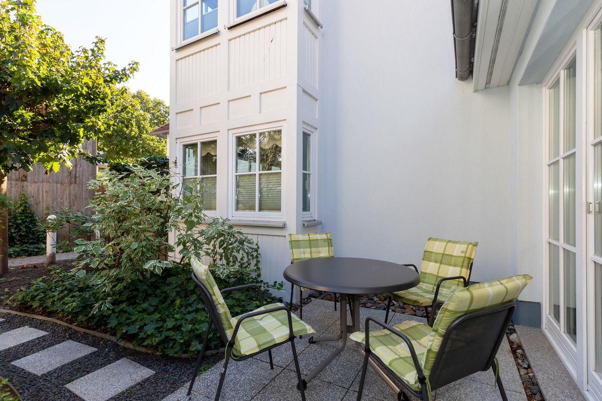 Das moderne und helle Wohn-/Esszimmer verfügt über eine separate Sitzgruppe mit bequemer Couch, einen Korbsessel und Couchtisch, einen separaten Esstisch mit 4 Stühlen, ein Sideboard sowie verschiedene Hängeschränke. Vom Wohnzimmer aus haben Sie direkten Zugang zu der ca. 7 m² großen Terrasse (nach Osten zum Innenhof ausgerichtet) mit Terrassenmöbeln. Hier sitzen Sie entspannt und gemütlich im Grünen und können abends bei einem guten Glas Wein in Ruhe die lauen Sommernächte genießen!
