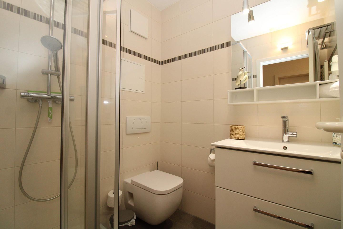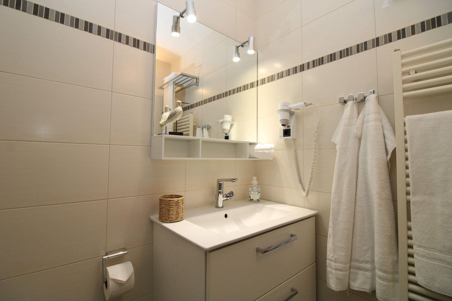 Das neue und moderne Badezimmer verfügt über eine Echtglas-Dusche mit niedrigem Einstieg, Waschbecken mit großem Spiegel und geräumigem Unterschrank, WC, Föhn, einen Handtuch-Heizkörper sowie ausreichend Ablagemöglichkeiten.