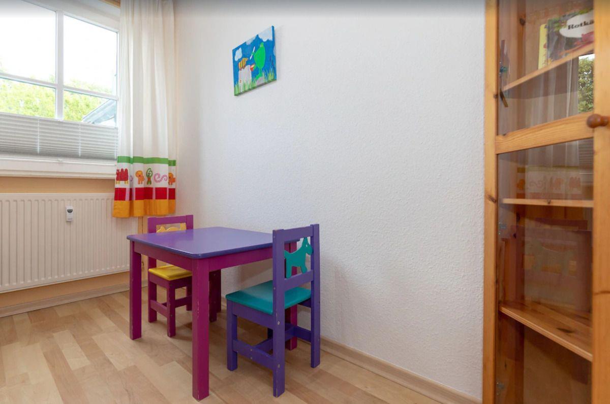 Das separate und zusätzliche 2. Schlafzimmer (Kinderzimmer) verfügt über ein bequemes Etagenbett (90 cm x 200 cm) für 2 Personen, einen Schrank sowie einen kleinen Kindertisch mit 2 Stühlen.