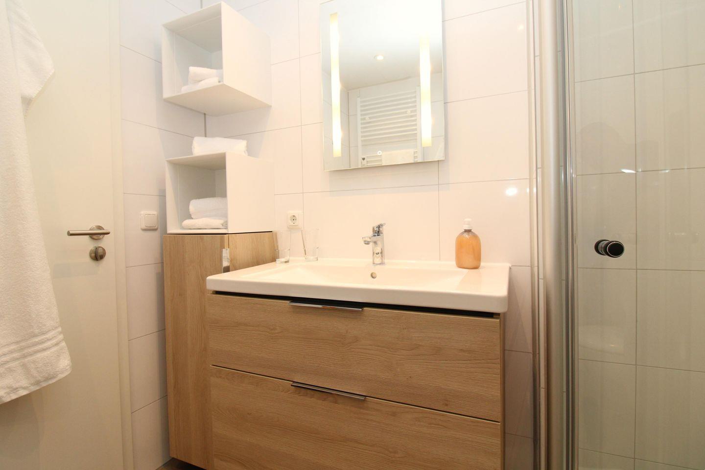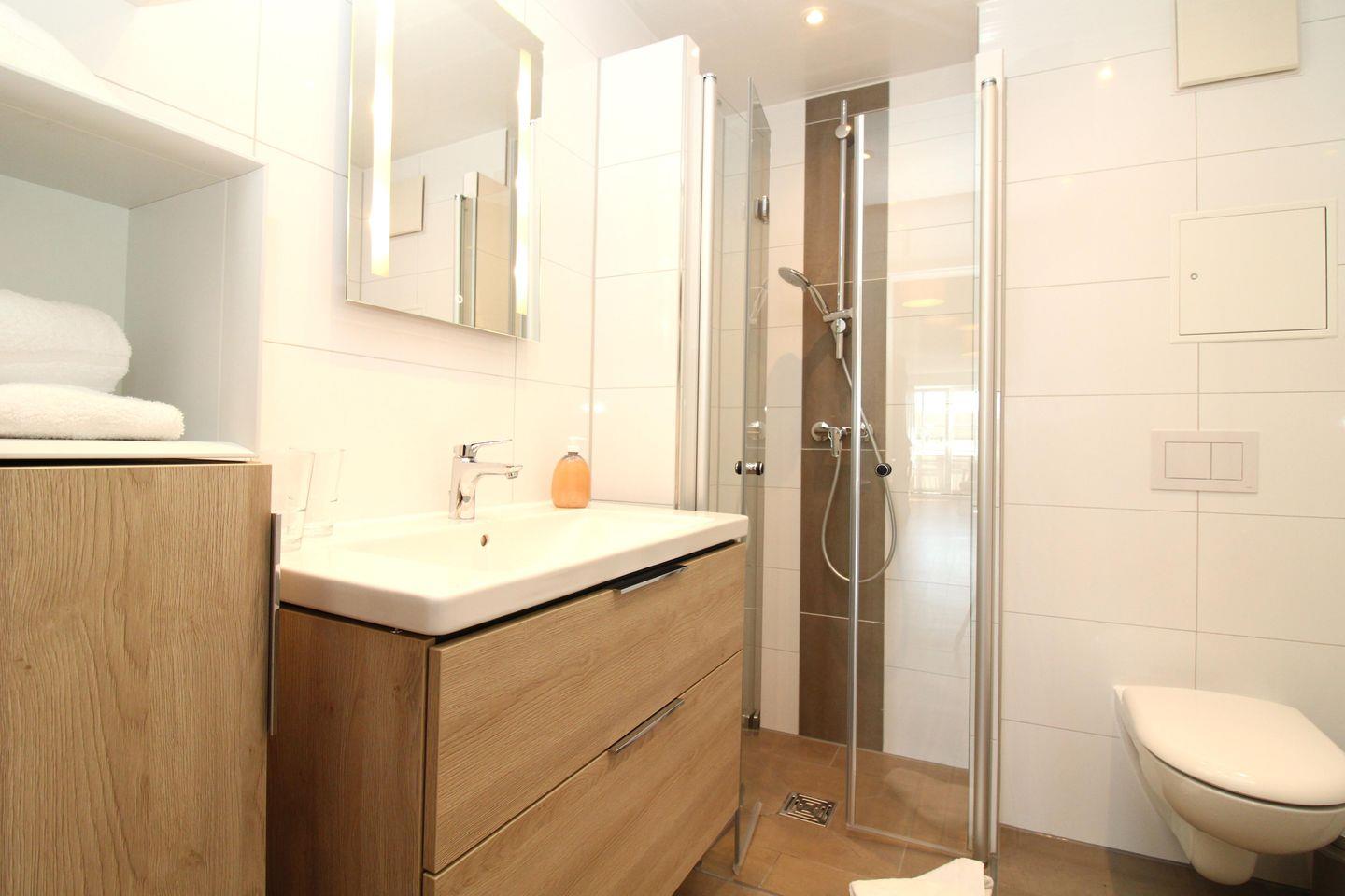 Das im Jahr 2025 neu renovierte moderne Badezimmer verfügt über eine Echtglas-Dusche mit bodengleichem Einstieg (seniorenfreundlich!), einen Waschtisch mit Unterschrank, WC, ein Regal, einen Handtuch-Heizkörper sowie ausreichend Ablagemöglichkeiten.