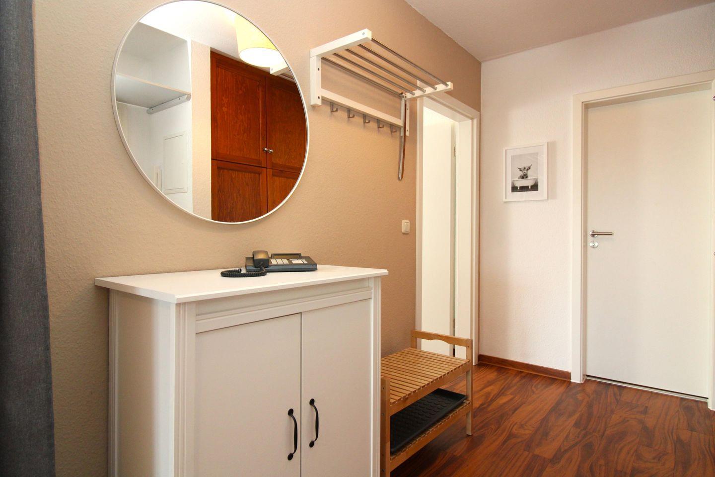 Von der Diele mit Garderobe, Einbauschrank, Kommode, Sitzbank und Wandspiegel erreichen Sie bequem alle Räume Ihrer Ferienwohnung.
