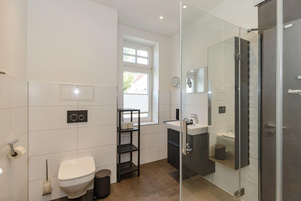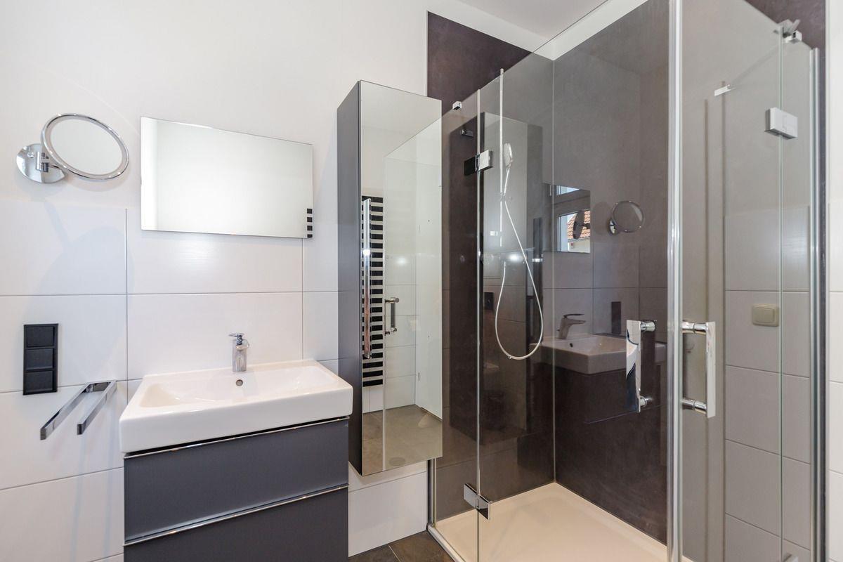 Das moderne Badezimmer (mit Tageslicht / Fenster) verfügt über eine Echtglas-Dusche mit bodengleichem Einstieg, Waschtisch mit Unterschrank, Kosmetikspiegel, Föhn, einen geräumigen Badezimmerschrank, ein Regal, einen Handtuch-Heizkörper, WC sowie ausreichend Ablagemöglichkeiten.