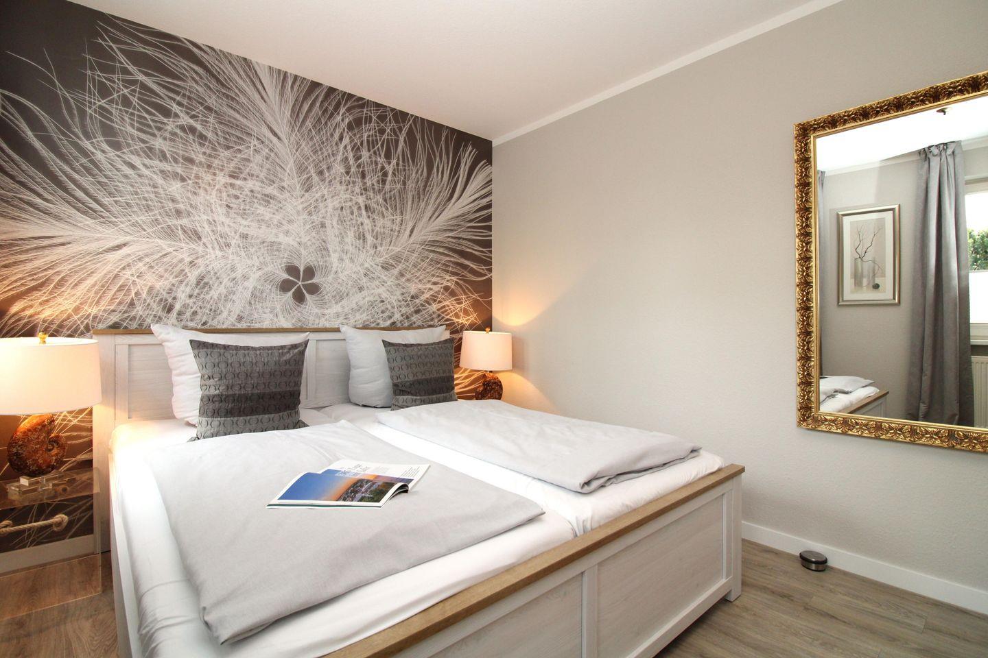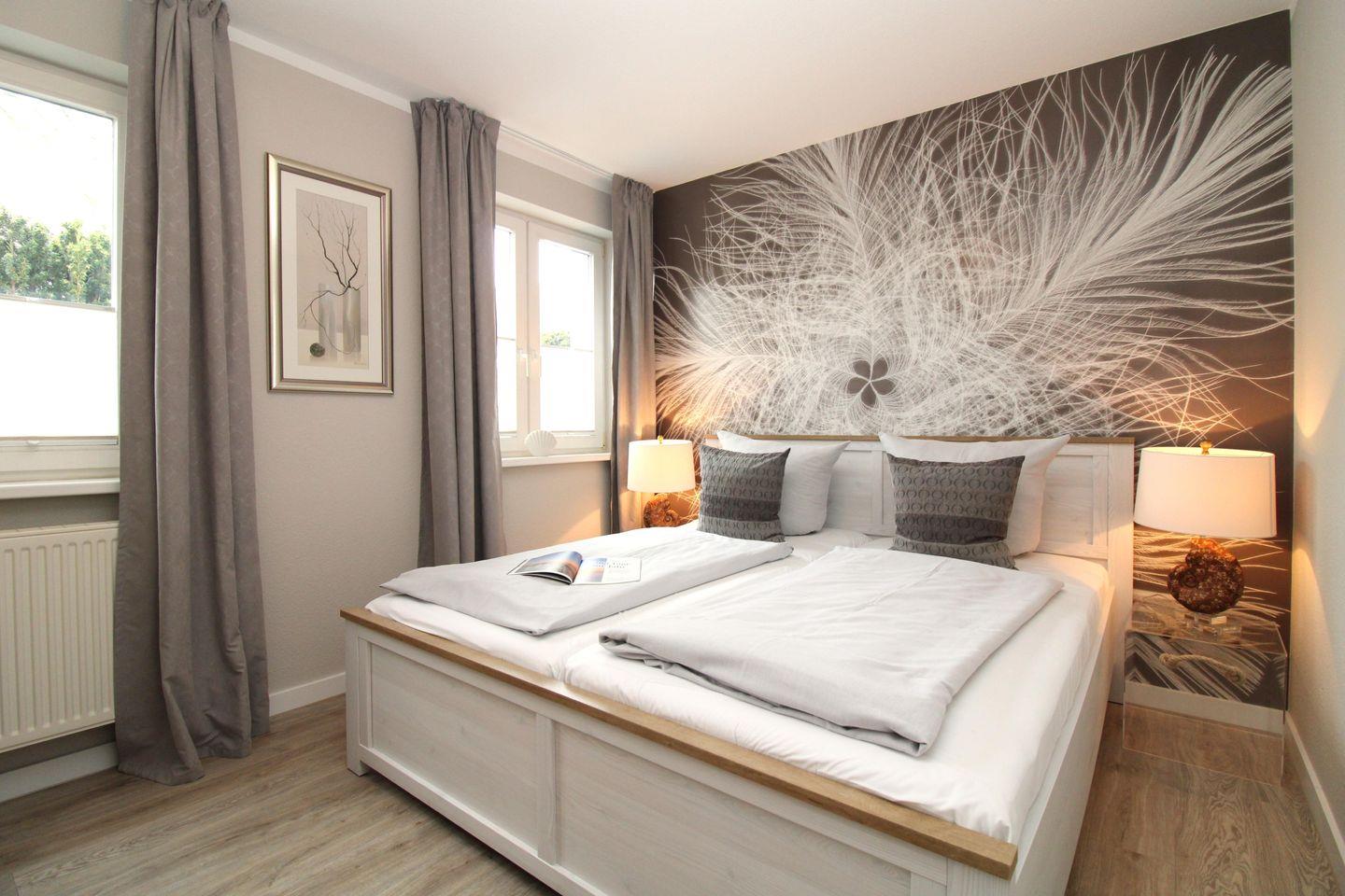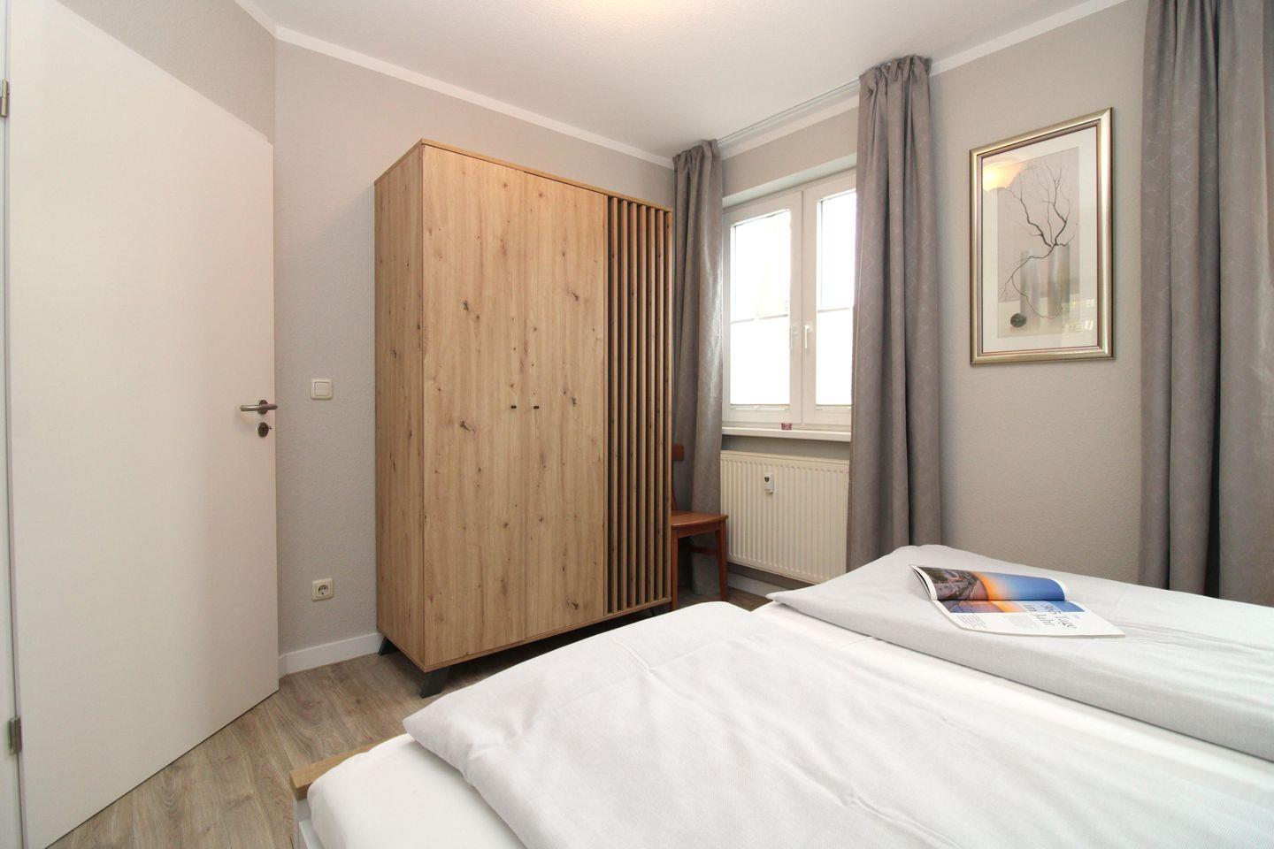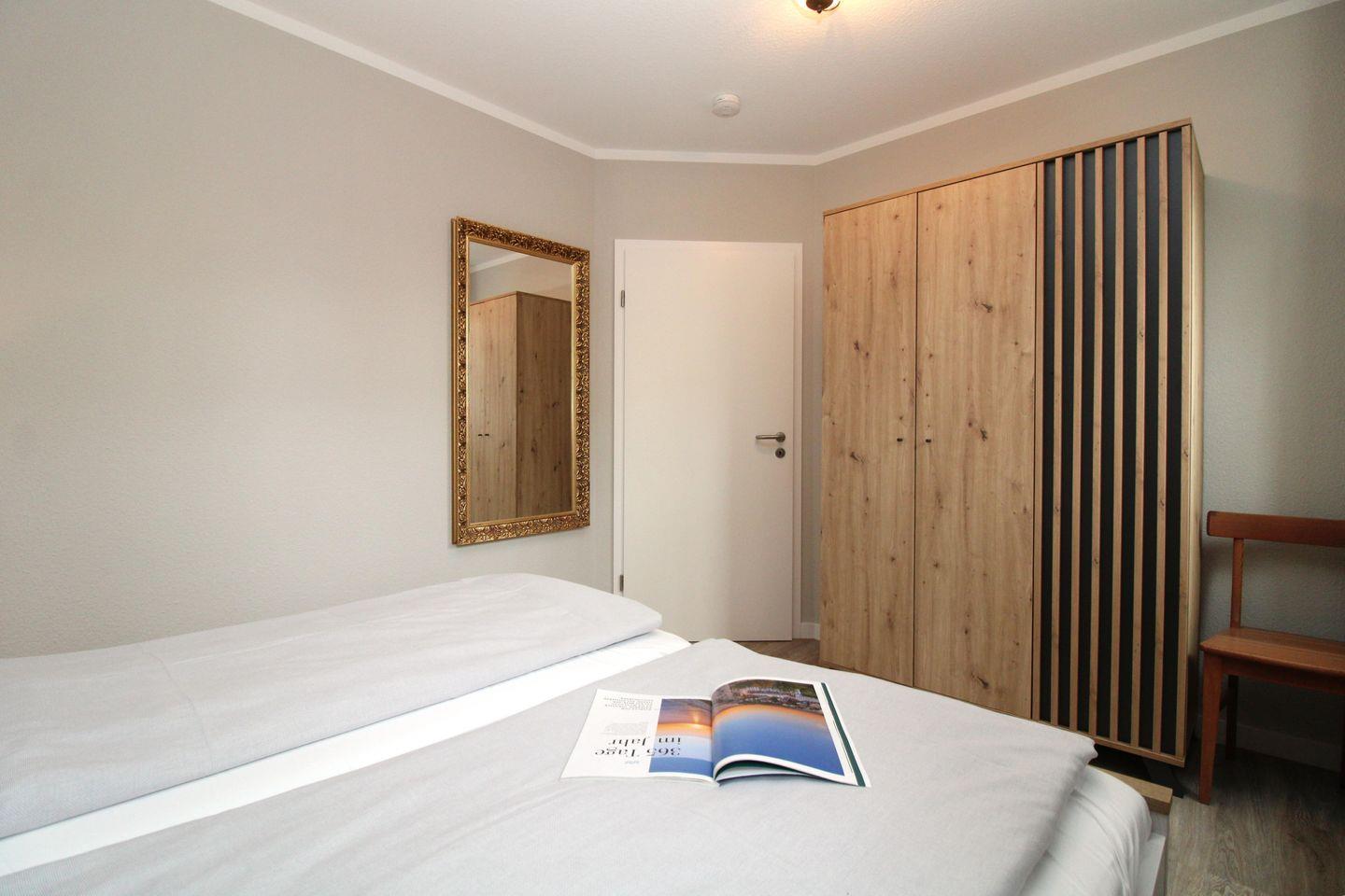 Das freundliche und gemütliche Schlafzimmer ist mit einem bequemen Doppelbett (2 x 80 cm x 200 cm), Nachttischen mit Nachttischlampen, einem geräumigen Kleiderschrank sowie einem großen Wandspiegel eingerichtet. Für einen guten Schlafkomfort ist das Schlafzimmer mit Verdunkelungs-Vorhängen bzw. Rollos ausgestattet.