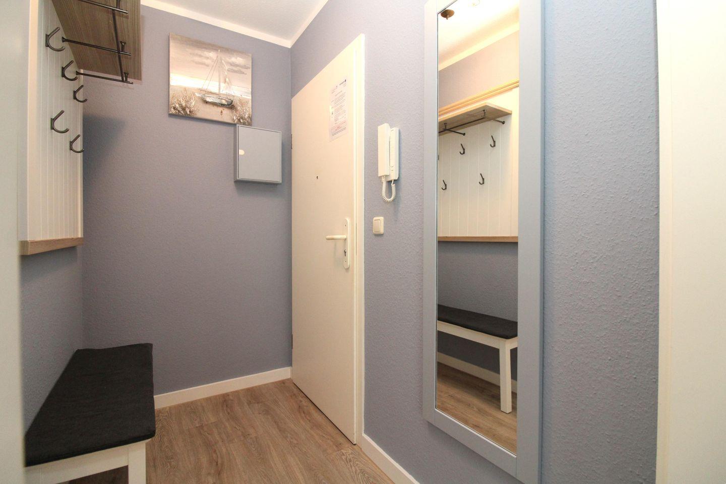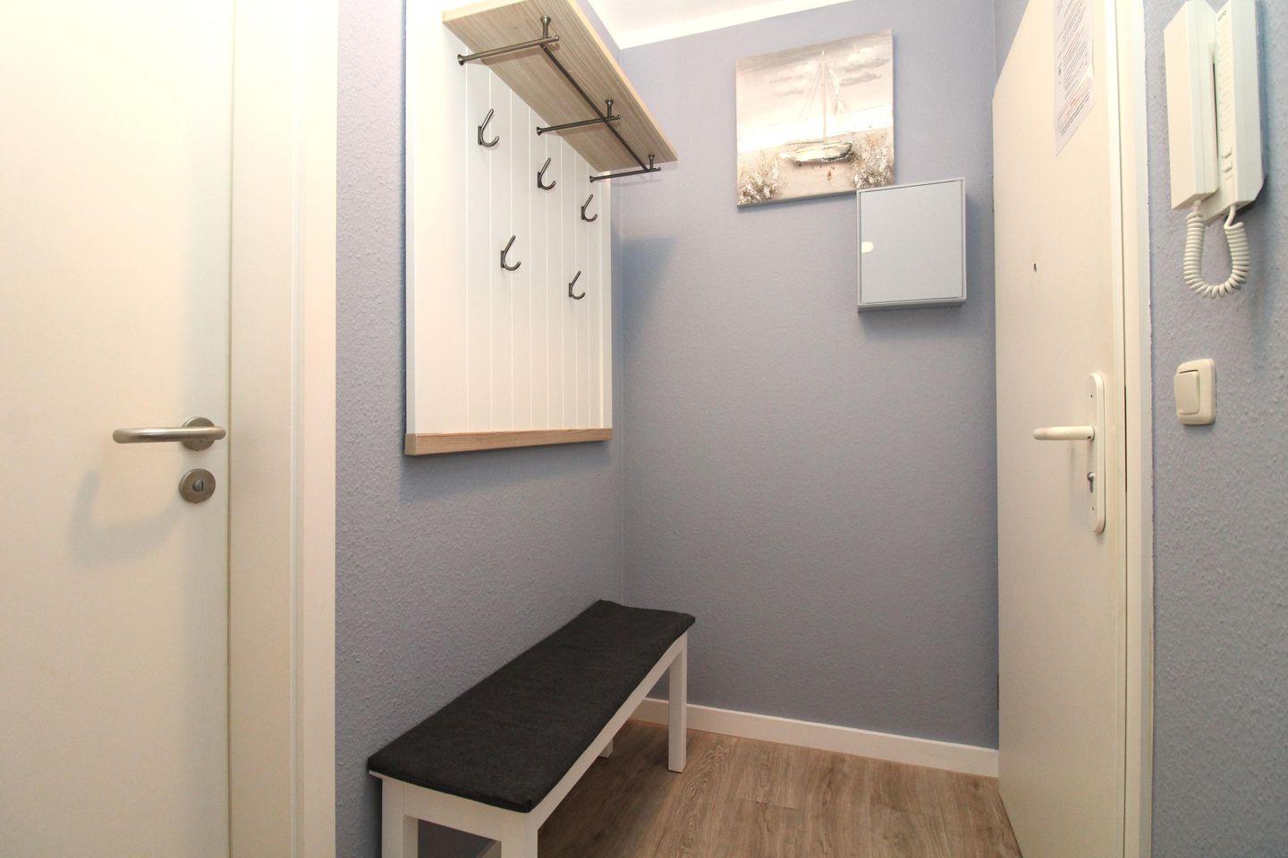 Ihre Jacken und Schuhe können an der großen Garderobe mit Sitzbank und Wandspiegel im Eingangsbereich des Appartements untergebracht werden.