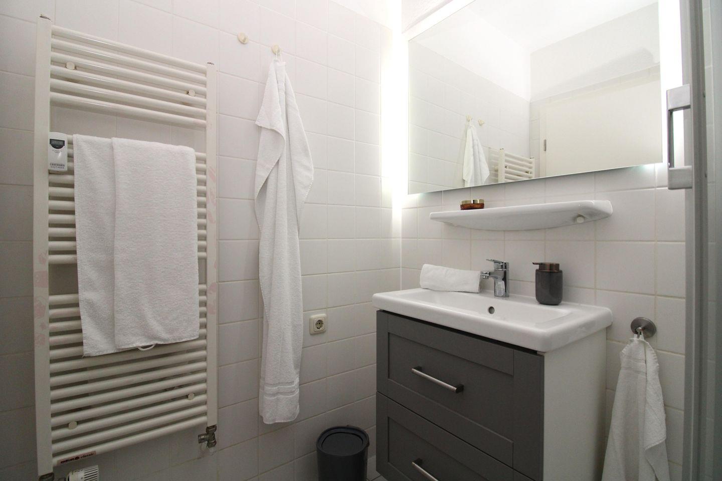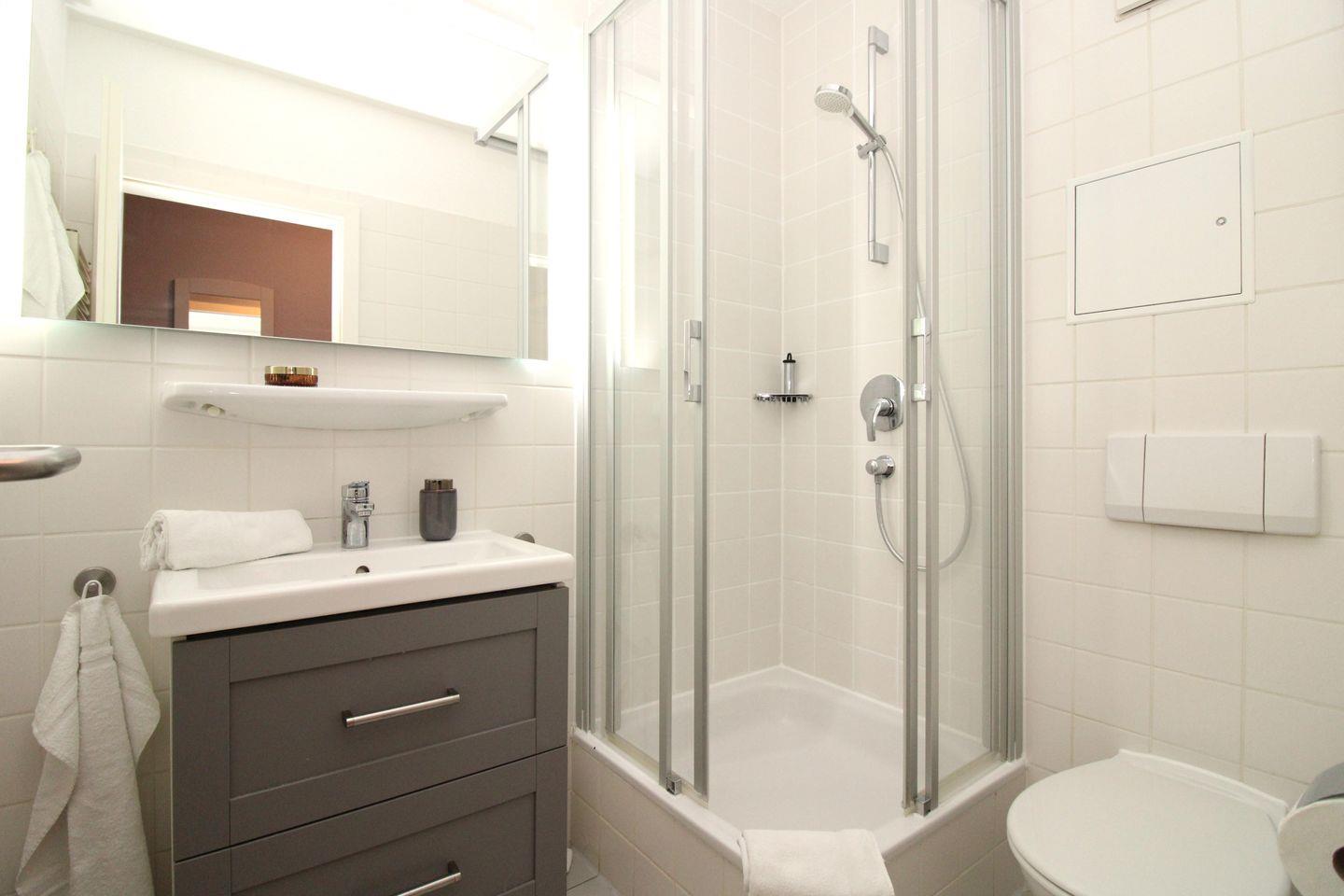 Das moderne Badezimmer verfügt über eine Dusche mit Echtglas-Abtrennung, Waschbecken mit Unterschrank, WC, Handtuch-Heizkörper, Föhn sowie ausreichend Ablagemöglichkeiten.