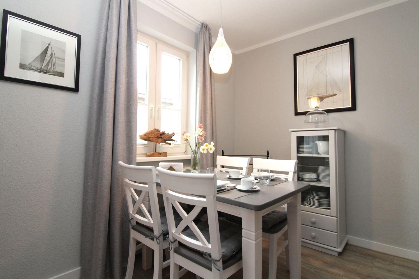 Das geräumige Wohn-/Esszimmer verfügt über eine separate Sitzgruppe mit bequemer Couch, Sessel und Couchtisch, einen separaten Esstisch mit 4 Stühlen, ein Sideboard sowie 2 Kommoden. Vom Wohnzimmer aus haben Sie direkten Zugang zu der ca. 4 m² großen möblierten Terrasse (nach Nord-Osten zum Innenhof ausgerichtet). Hier sitzen Sie entspannt und gemütlich und können abends bei einem guten Glas Wein in Ruhe die lauen Sommernächte genießen.