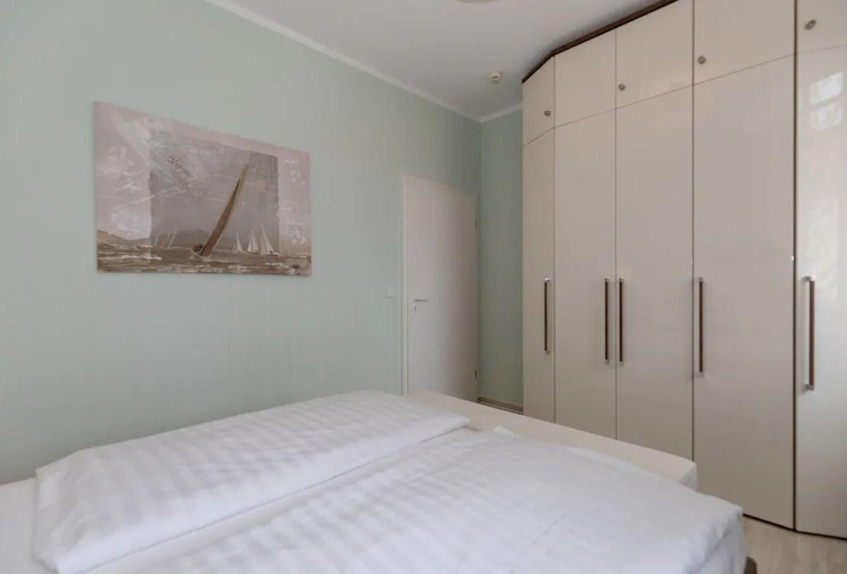 Das geräumige 1. Schlafzimmer ist mit einem bequemen Boxspring-Doppelbett (2 x 80 cm x 200 cm), Nachttischen mit Nachttischlampen, einer Sitzbank sowie einem geräumigen Kleiderschrank eingerichtet.