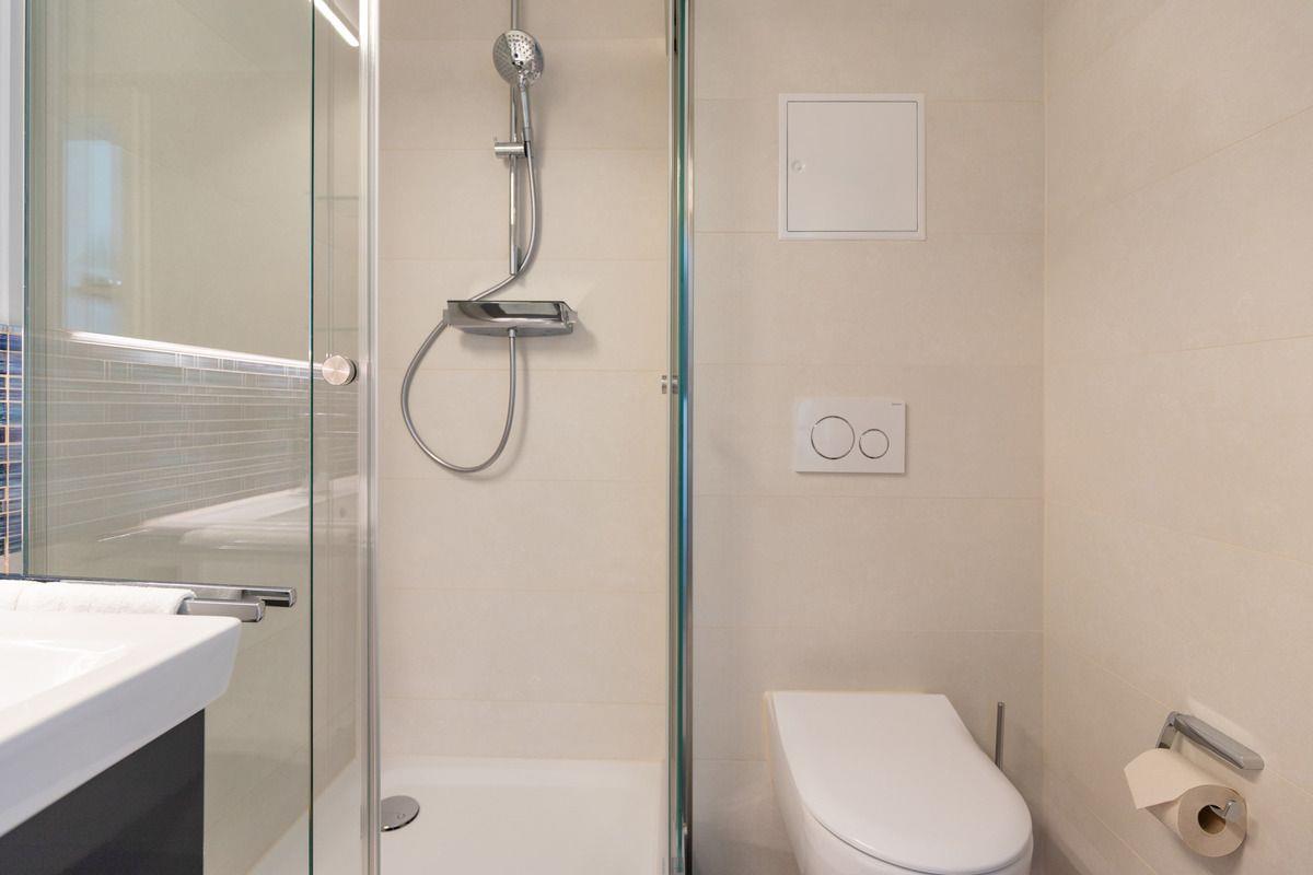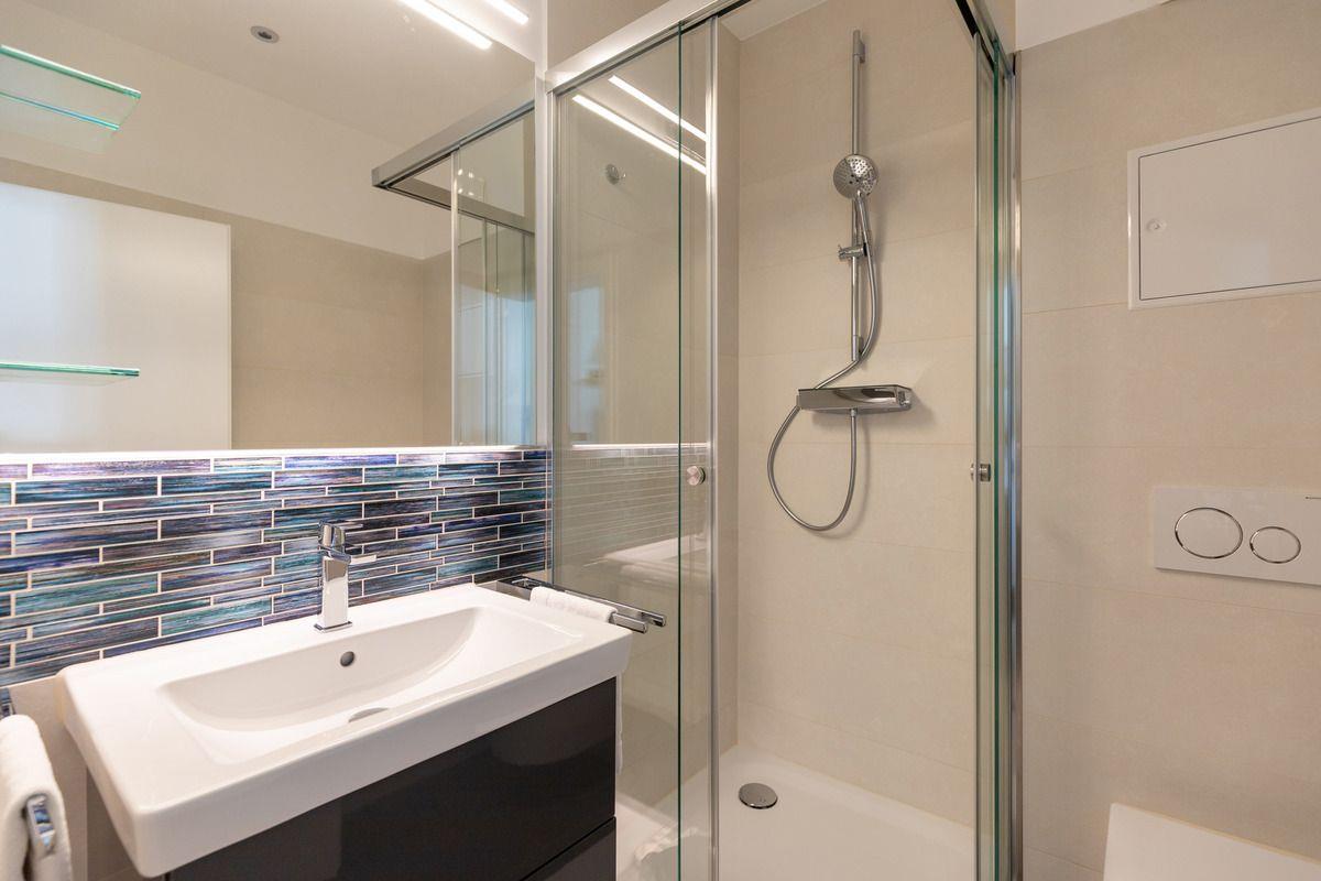 Das 2024 modernisierte Badezimmer verfügt über eine Echtglas-Dusche mit niedrigem Einstieg, Waschbecken mit Unterschrank, großen Wandspiegel, WC, Föhn, Handtuch-Heizkörper sowie ausreichend Ablagemöglichkeiten.