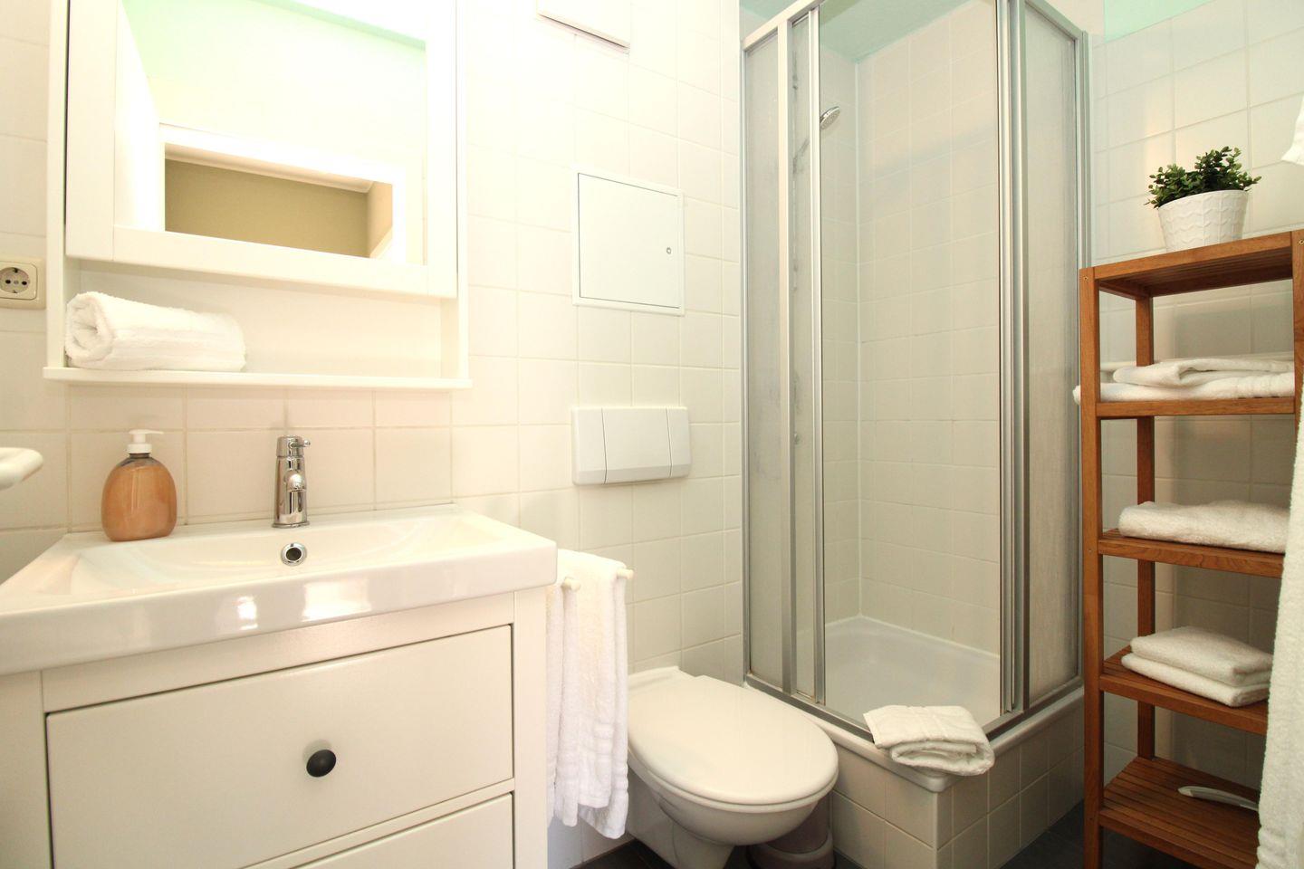 Das freundliche Badezimmer verfügt über eine Dusche, Waschbecken mit Spiegelschrank sowie Unterschrank, WC, einen Föhn, ein großes Badezimmerregal sowie ausreichend Ablagemöglichkeiten.
