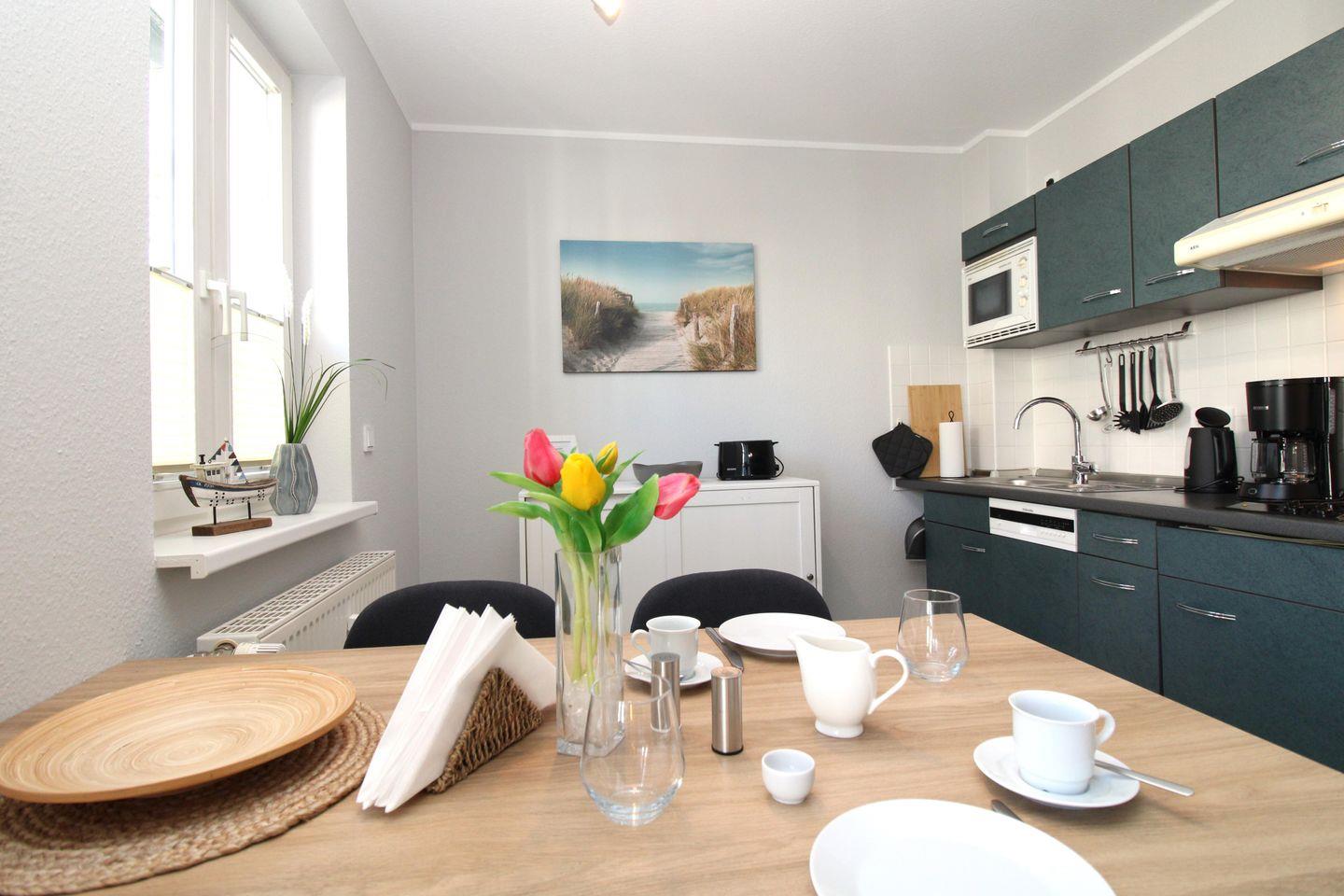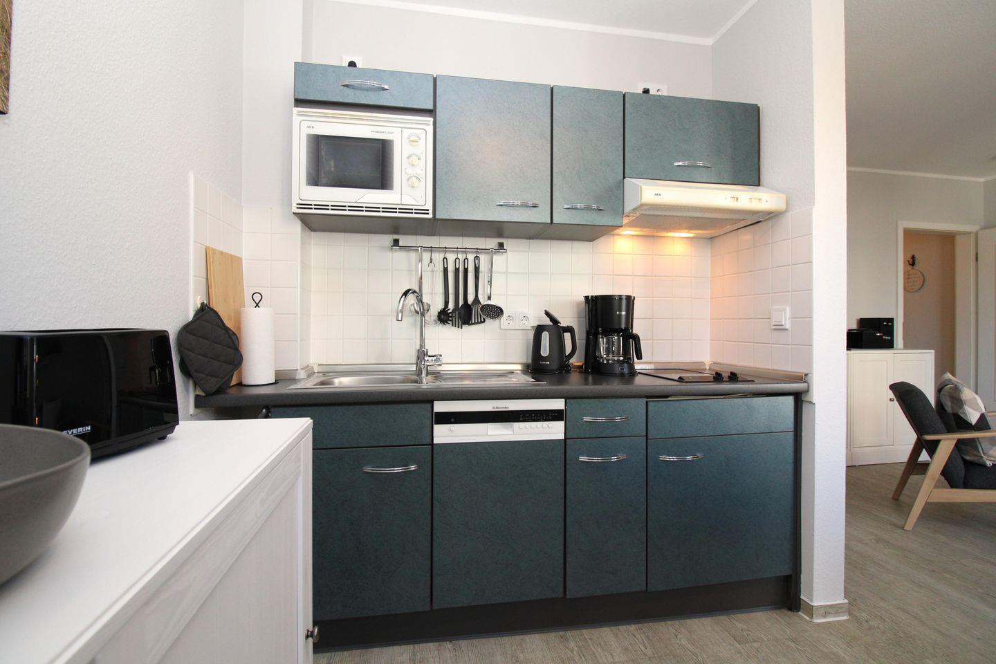 Die offene Küche beinhaltet eine voll ausgestattete Einbauküchenzeile mit 2-Zonen-Ceran-Kochfeld, Dunstabzug, Mikrowelle, Kühlschrank mit Gefrierfach, Geschirrspülmaschine, Kaffeemaschine, Wasserkocher und Toaster. Auf Wunsch stellen wir Ihnen auch gerne einen portablen Backofen zur Verfügung. Die Küche ist mit Geschirr, Gläsern, Besteck und Töpfen komplett ausgestattet.