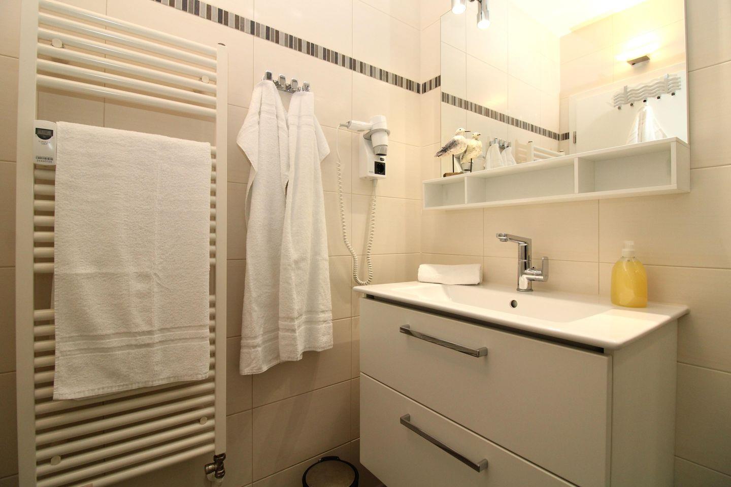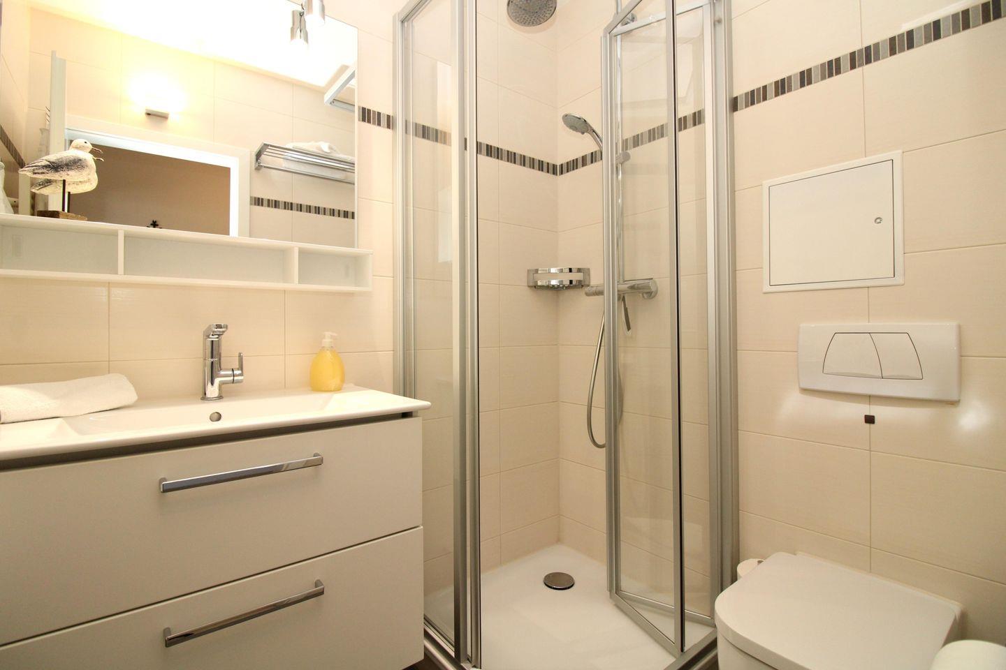 Das moderne Badezimmer verfügt über eine Dusche mit niedrigem Einstieg, Waschbecken mit Unterschrank, WC, Handtuch-Heizkörper, Föhn sowie ausreichend Ablagemöglichkeiten.