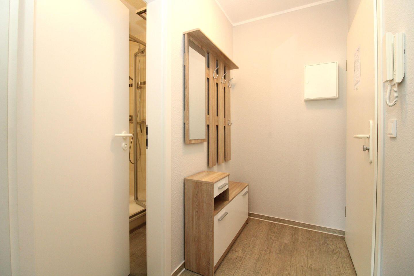 Ihre Jacken und Schuhe können Sie an der Garderobe mit Schuhschrank und Spiegel im Flur der Wohnung unterbringen.